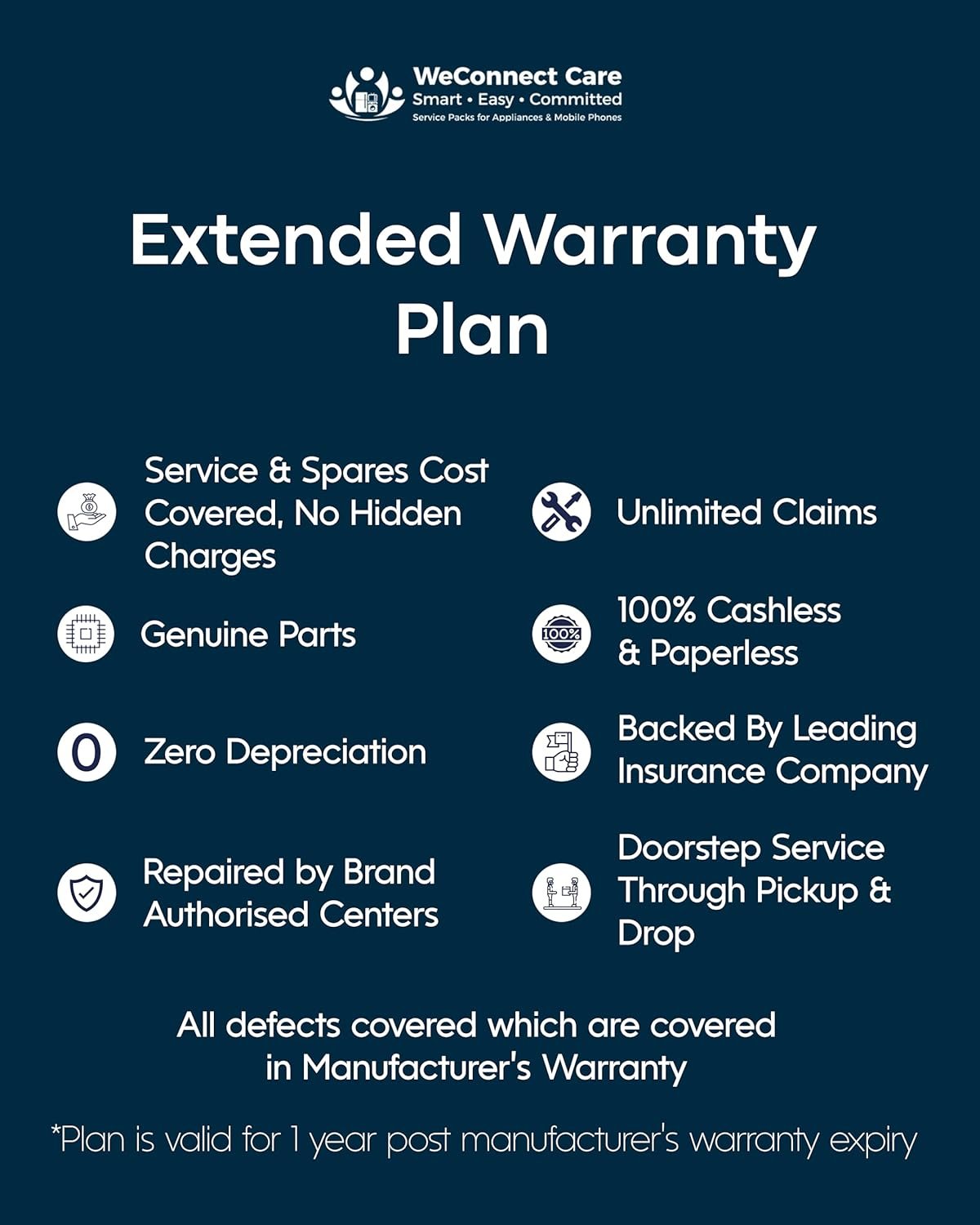 WeConnect Care Service Pack is a comprehensive service contract with insurance cover, backed by ICICI Lombard. It provides All-Risk Accident, Liquid & Physical Damage Protection, covering physical damage, liquid spills, and screen malfunctions. Additionally, it includes a 1-year Extended Warranty, which begins immediately after the expiry of the manufacturer’s original warranty, ensuring continued coverage against all defects originally covered by the brand. This dual-layer protection offers complete peace of mind for your device.