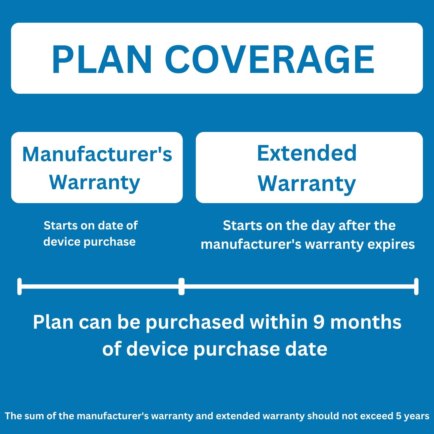 COVERAGE: The plan covers all defects & malfunctions under the original manufacturer’s warranty. The plan starts the day after the manufacturer’s warranty ends. It does not cover physical or liquid damage, accessories, consumables or parts that are not covered under the standard manufacturer’s warranty.