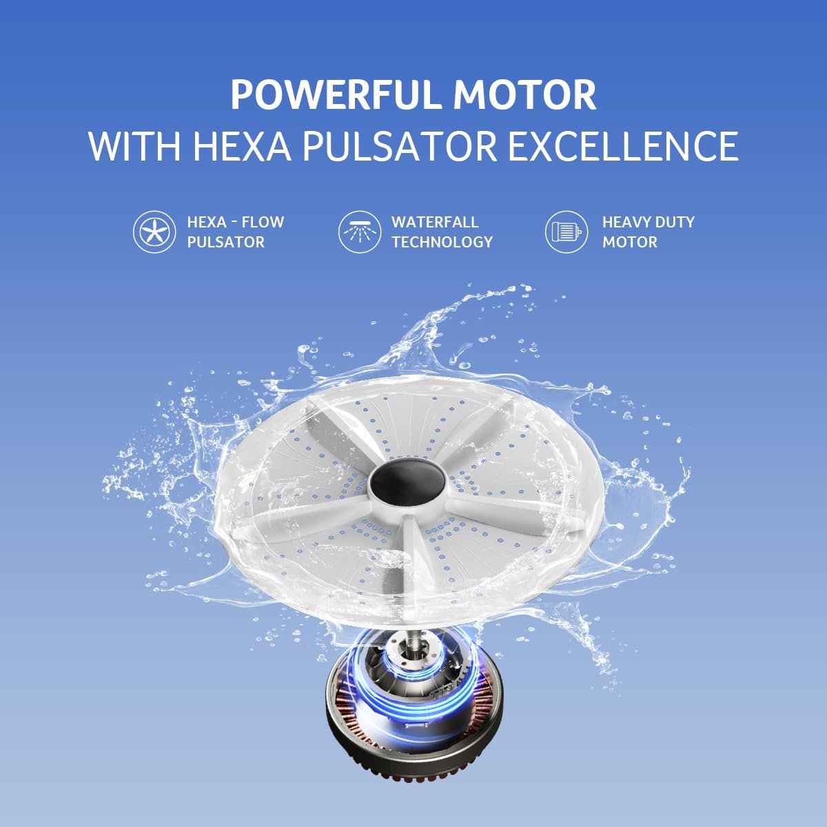 Ultra Motor: Robust wash motor with Hexa Flow Pulsator for enhanced washing performance, accelerated spin-drying with 1300 RPM, removing excess water efficiently.