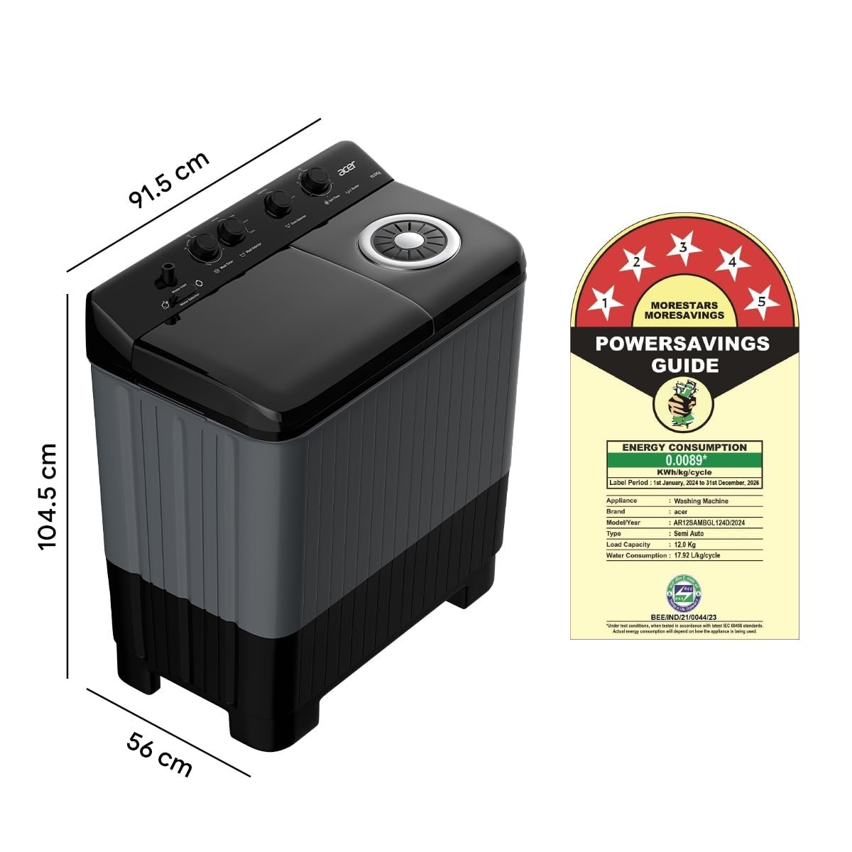 Acer 12.0 Kg 5 Star Semi-Automatic Top Loading Washing Machine (AR12SAMBGL124D, Black-Grey, 4 Wash Programs, Hexa Flow Pulsator, Advanced Lint Filter)
