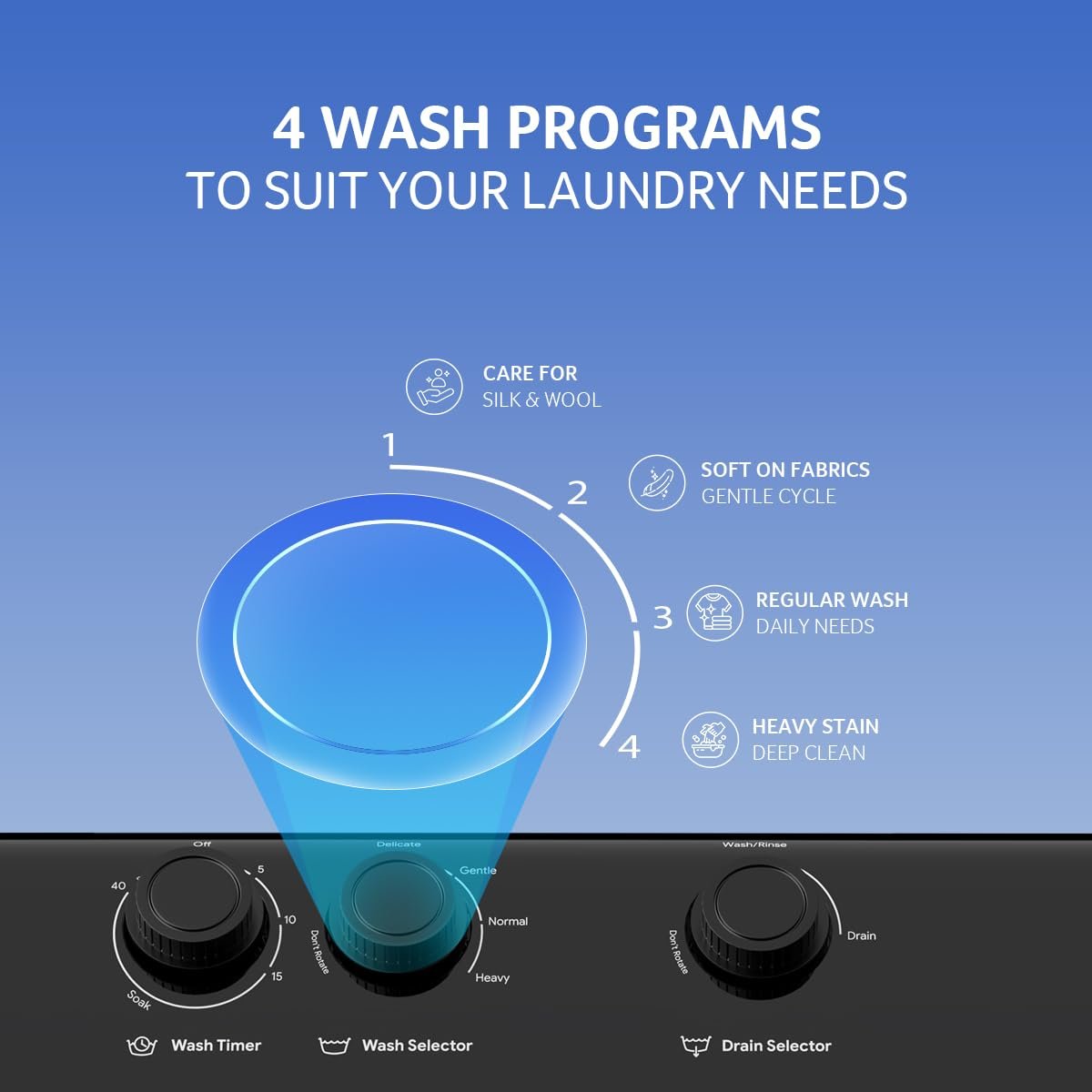 4 Wash Programs: To suit all your laundry needs. Programs include Delicate, Gentle, Normal, and Heavy modes.