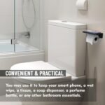 LARGE & SAFE PHONE SHELF: Upper edge of toilet paper holder with storage prevents phone or other stuff from falling off, the phone shelf is large enough to hold various items, such as Phone Max, bluetooth speaker, wet wipes or air freshener etc. This stick on toilet paper holder stand fits most of size paper rolls.