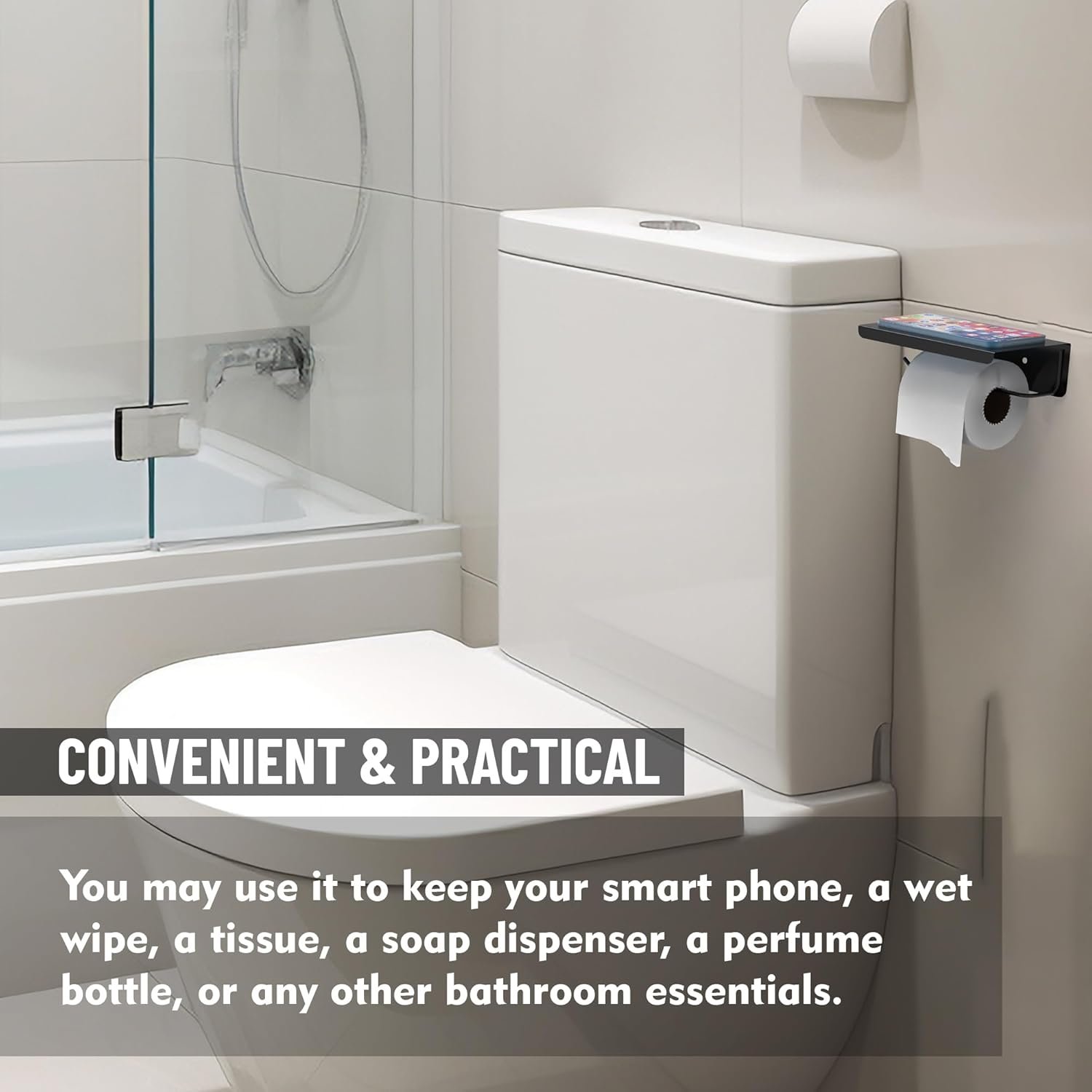 This toilet paper holder transforms the wasted space into a spacious storage area. the shelf is very convenient for placing lots of things. Simple and clean design paired with polished matt, This shelf will also give a touch of elegance to your bathroom!