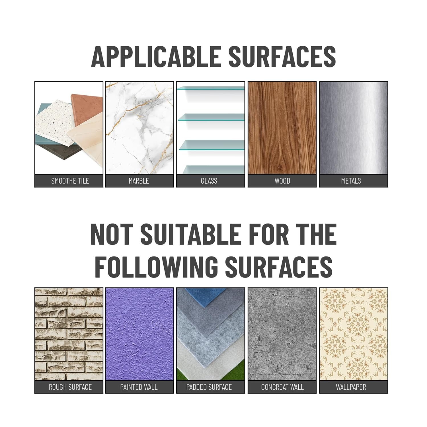 Please avoid this using on rough surface, Padded wall, Painted wall, Concrete wall and wallpapers as self adhesive glue wont hold firmly on this surfaces