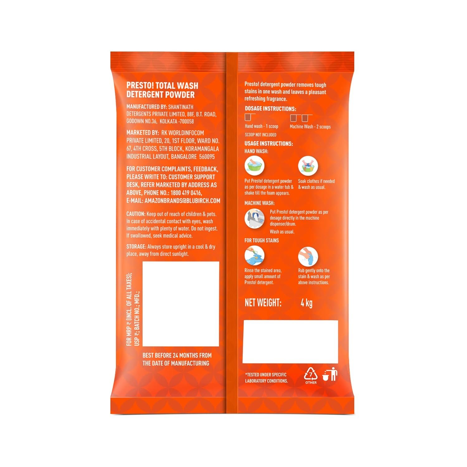 Amazon Brand – Presto! Total Wash Detergent Powder | 4 Kg | Tough On Stains | Safe and Gentle on Fabrics | Refreshing Fragrance | Machine And Hand Wash | Bleach-Free Washing Powder