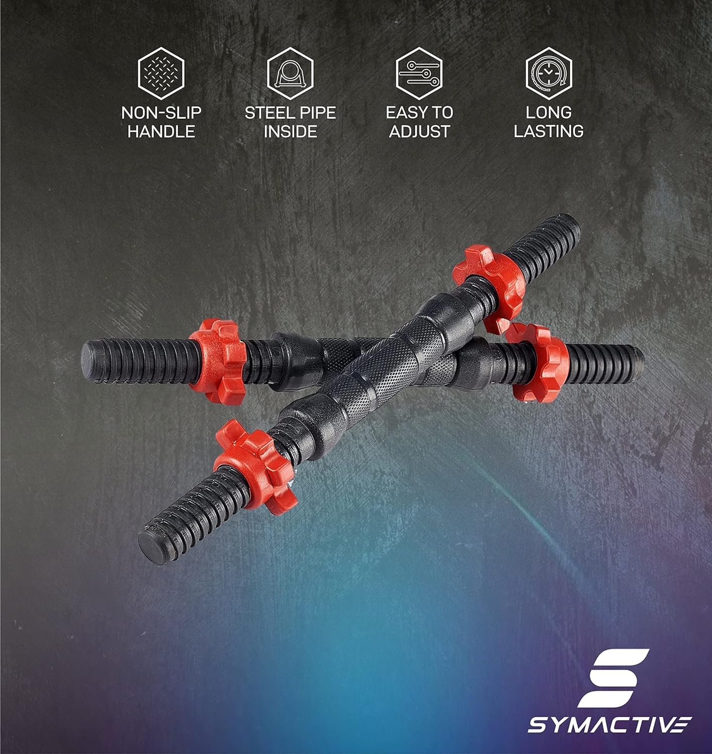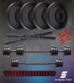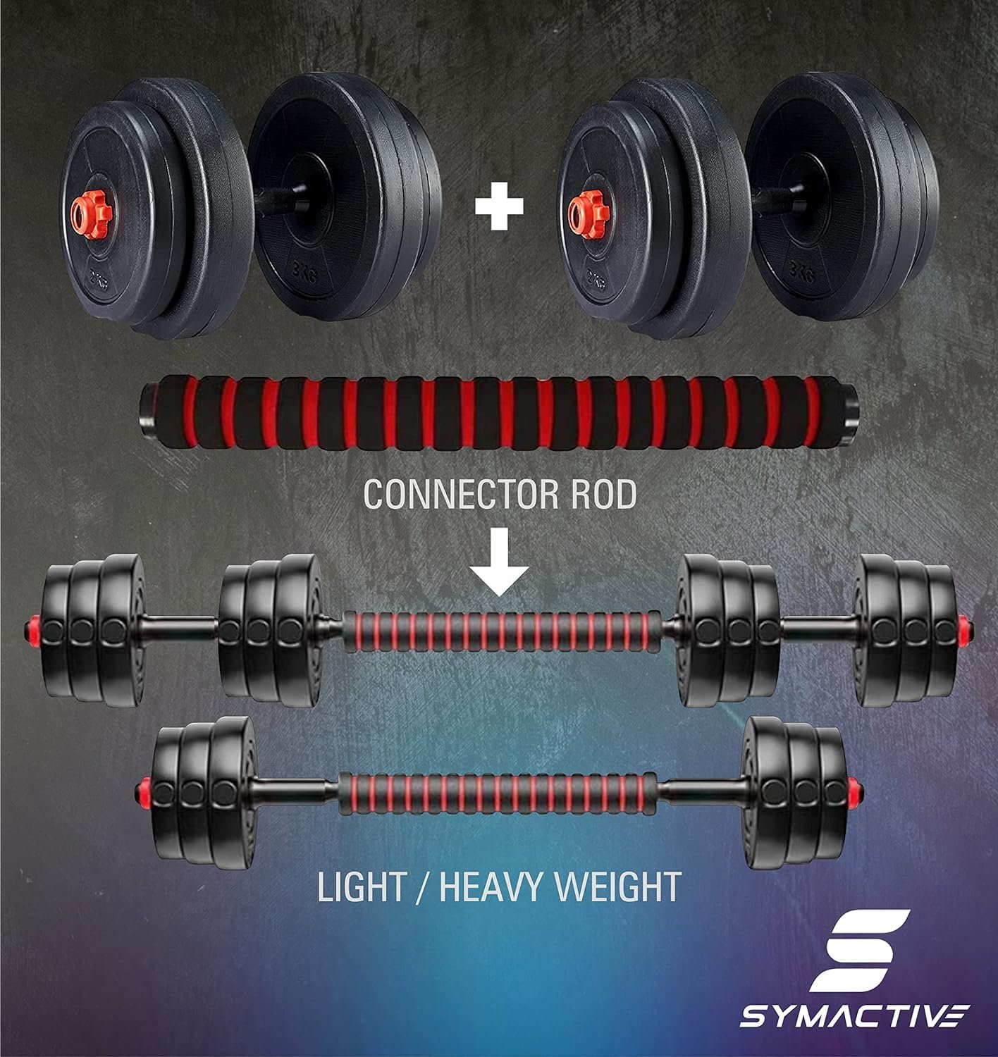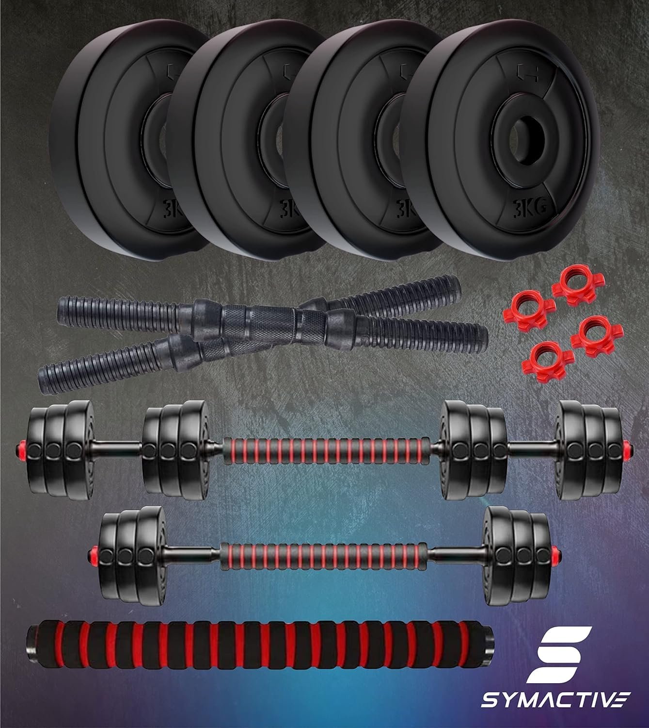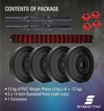 Amazon Brand – Symactive PVC 12 Kg 3-in-1 Convertible Dumbbells Fitness Kit for Full Body Workout (3 Kg x 4 PVC Weight, 14” Dumbbell Rods Pair & Nuts, 1 Cushioned Connector Rod)