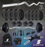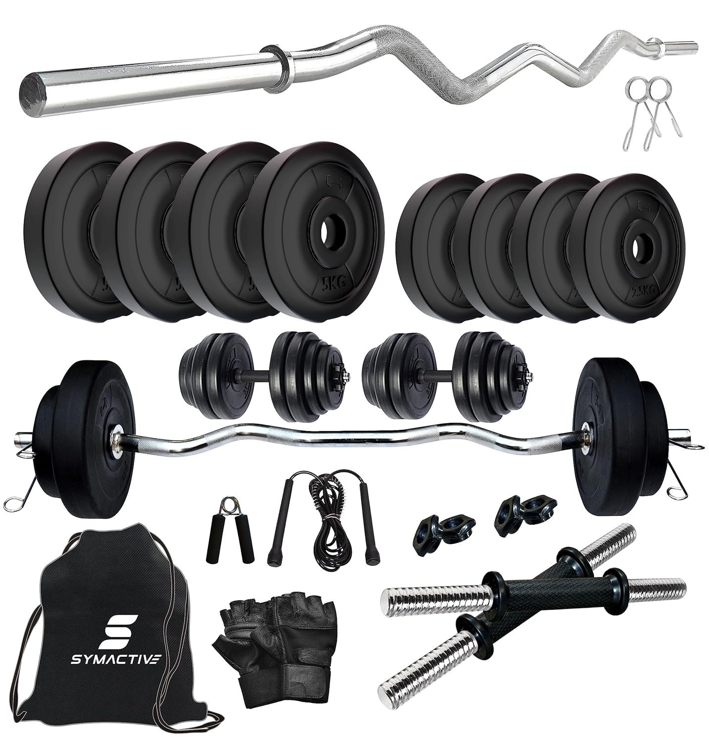 Package contents: 30 Kg PVC Weight, 3 Ft Curl Rod, 14” Dumbbell Rods Pair, 4 Locks/Clippers, Skipping Rope, Gloves, Gripper, Bag