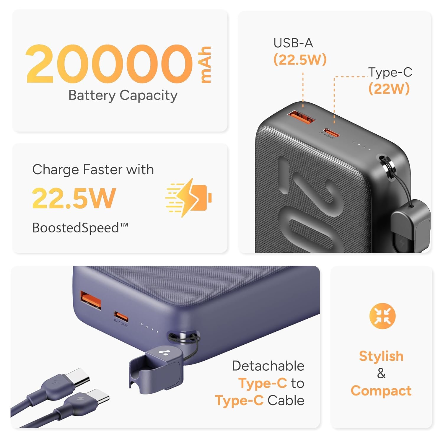 Level up your phone’s battery in minutes with 22.5W BoostedSpeed. No waiting time for fast-paced days, charge on the go with an attached cable for maximum convenience. No hassle of carrying an additional cable, this 2-in-1 loop & cable has got you covered!