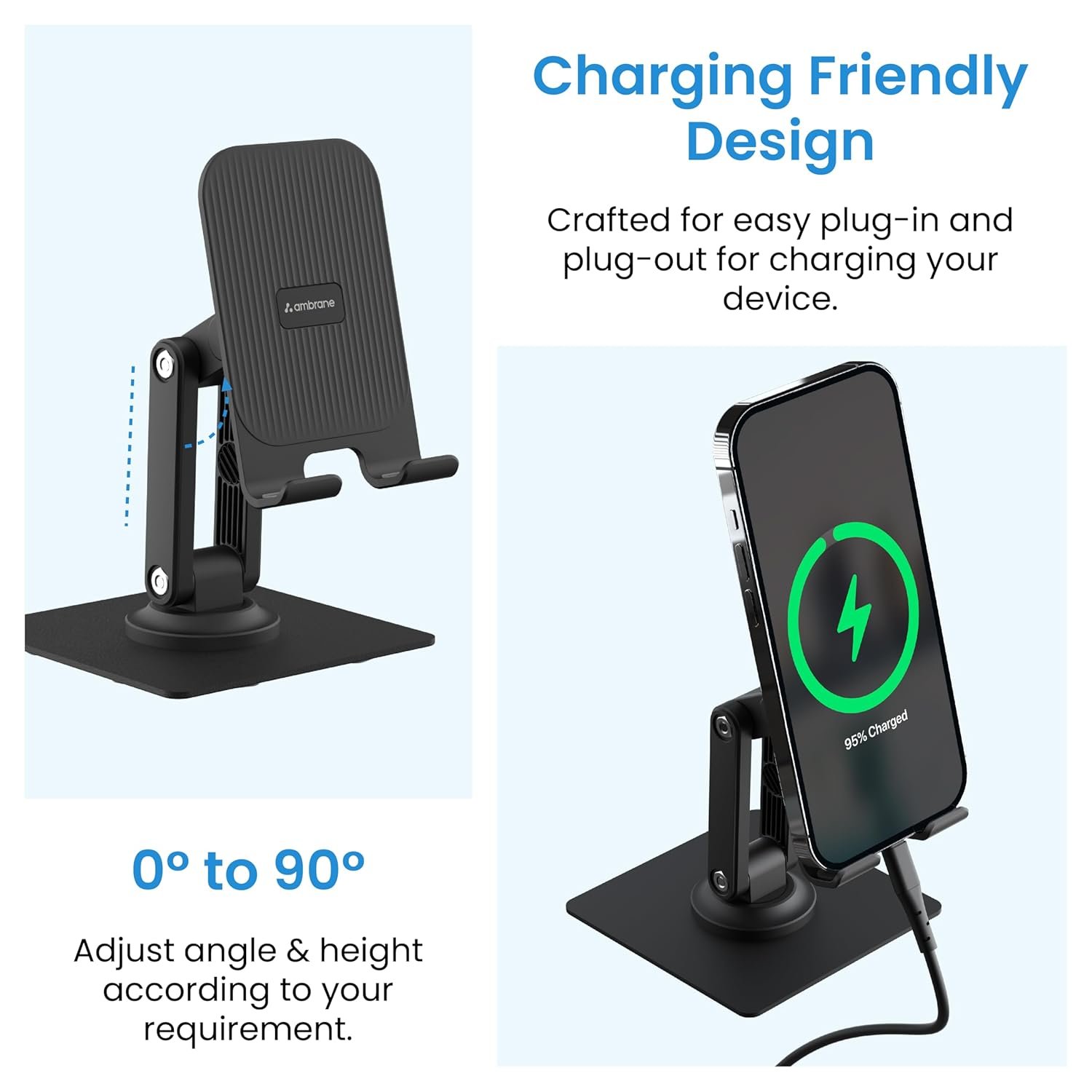 Keep your device powered up seamlessly with Twistand 360’s charging-friendly shape, ensuring easy access to charging ports while your smartphone rests securely in the stand.