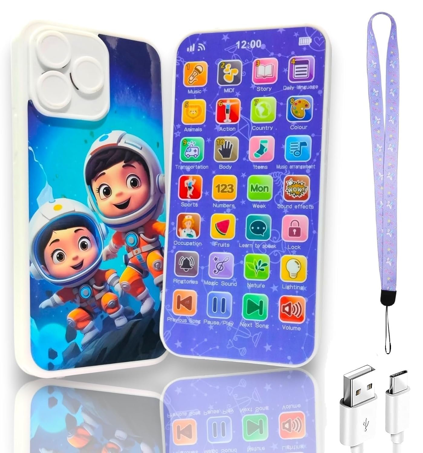 RECHARGEABLE PHONE TOY: The phone includes a 3.7v 150mAh Li-Po Rechargeable Battery (Included). Charging Time: 30 Min. The device can continuously play music for 3-4 hours after being fully charged! It comes with a USB Type-C charging cable.