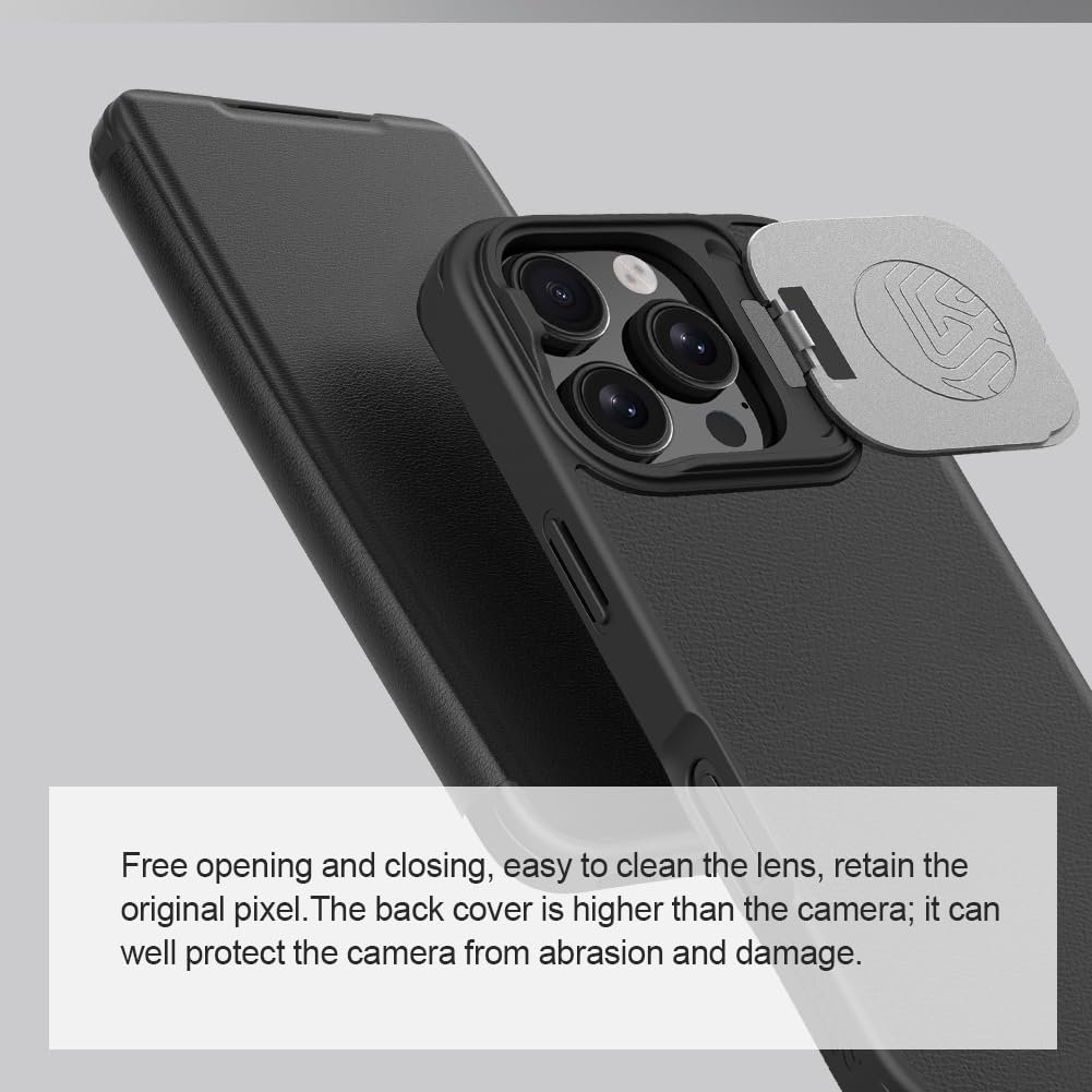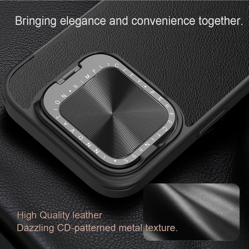 🔥【Unique Camera Cover Kickstand】iPhone 16 Pro flip case incorporates an upgraded metal camera cover, offering dual-layer protection for your fragile but precious lens. The cover features an innovative magnetic cover and frictionless closing tech, enabling automatic magnetic closing. It has passed over 12000 opening tests, ensuring a smoother and more reliable opening and closing performance.