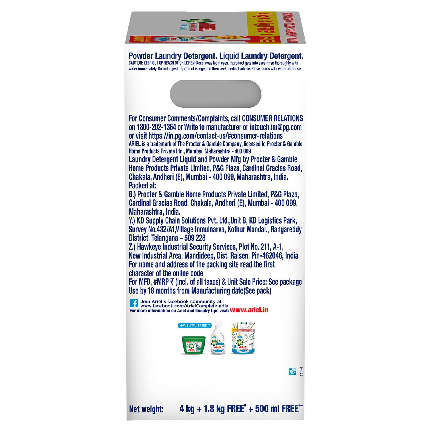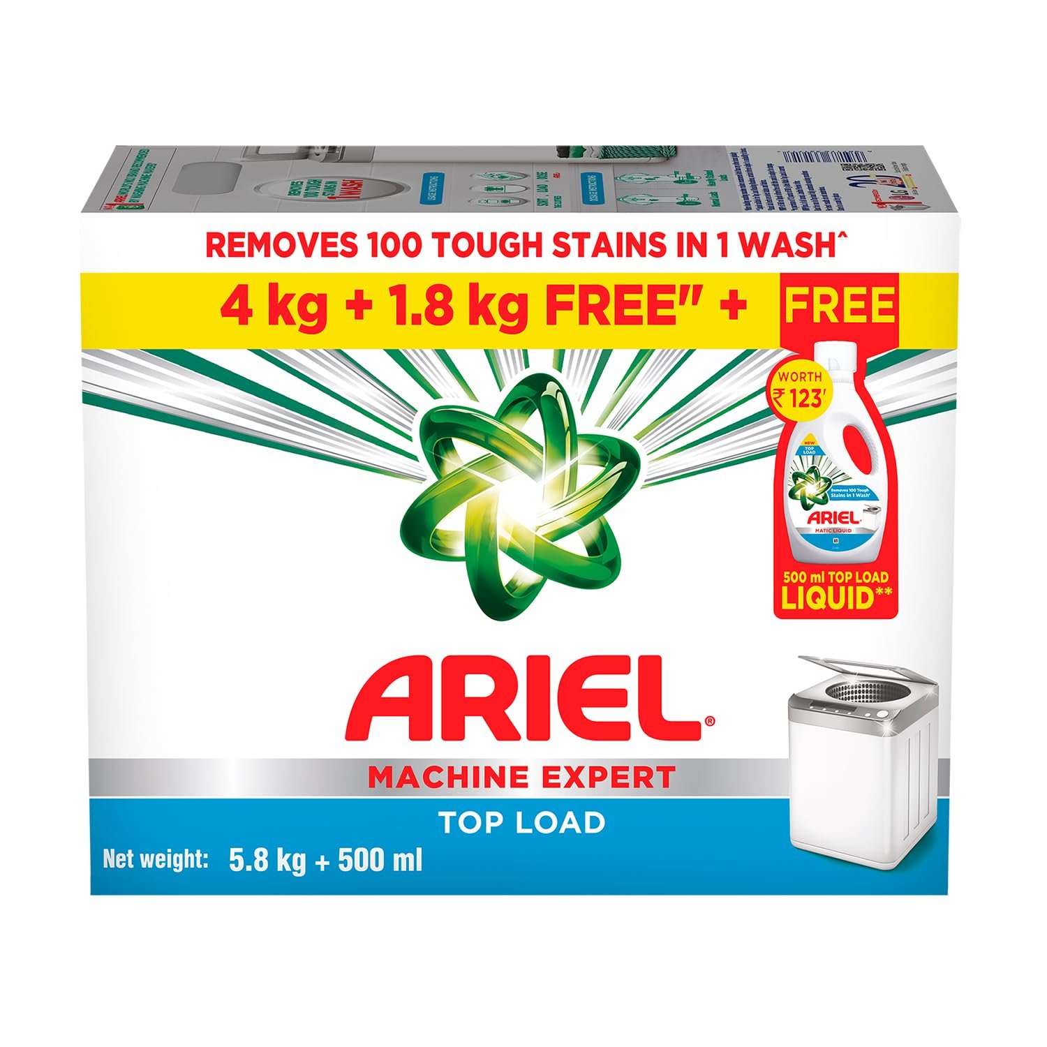 Ariel Matic detergent provides best cleaning in just 1 wash. It can tackle tough stains like tea, coffee, ketchup, turmeric etc. Ariel Matic Detergent Powder has been especially designed for Front Loading fully automatic washing machines (Top load for Top Load Variant). Ariel Matic Front Load (Top Load) detergent has oxi-stain fighters for an impeccable clean wash after wash. Ariel is World’s no. 1 brand recommended by washing machine manufacturers globally, like LG, Ariel Matic provides long lasting fragrance and deep-down cleaning to deliver a brilliant, clean and laundry experience. Now get 500ML Ariel Matic Liquid Detergent Free with Ariel Matic Powder (Limited period offer).