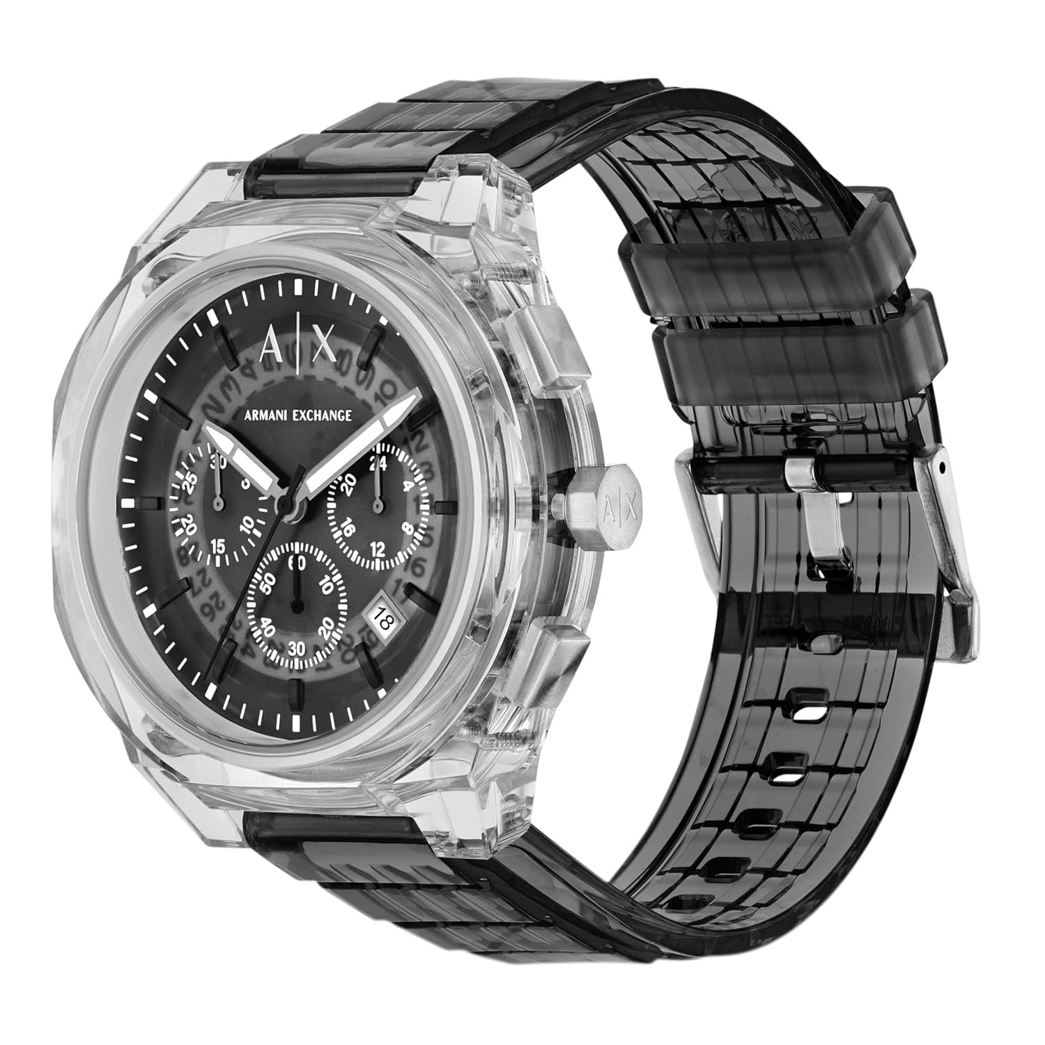 Armani Exchange’s 44mm watch features a gray glossy dial, chronograph movement, and sleek gray strap.