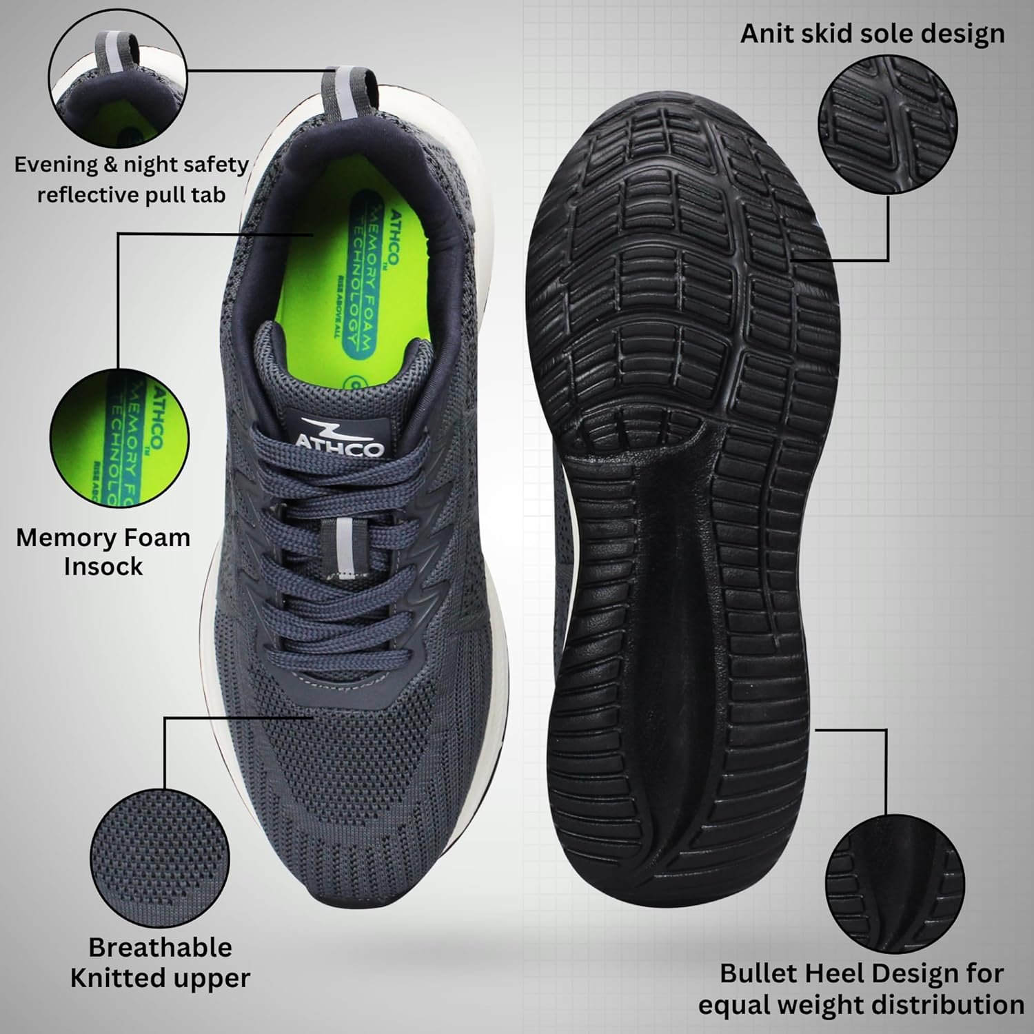 BHARAT’S Own BRAND FOR ENTIRE BHARAT “ATHCO” Brand is created for never dying attitude individuals to “RISE ABOVE ALL”. Our all the shoes with “MEMORY FOAM COMFORT” technology which will give wearer superior comfort while performing any kind of multifunctional activity like- Running, Walking, Gym, Casual wear, Daily wear. As a core values we are committed to provide best product to our consumers & keeping consumers in our mind we have infused below attributes in our all the products to perform best at all conditions. Upper & lining Material: – We are using extremely superior upper & lining material which gives user entire day out comfort. Our upper materials are breathable, skin friendly, soft feel, snug fit to perform best in all kind of activities. Sole Material: – Our light weight soles are fully flexible with bouncy in nature which will allow you to stand day long at your task & you can also walk many miles without feeling fatigue or Pain at your heel & calf area. These great flexible shoes help you to perform well & allow your best foot forward to safeguard you from any kind of sudden jerk or injuries. In-Socks Material: – We have used best “MEMORY FOAM” (8 mm thickness & 80 density foam) technology to provide you day long comfort. Our in-socks features will allow you to walk easy, run easy & gym easy. It will absorb shock to optimise the comfort at heel area. ATHCO Brand is from the house of “25 Year” old shoe Manufacturer of National Brands. Brand truly believes in delivering high performance & super most comfortable footwear to the consumers at an affordable price for all day wear. Our products are designed to give an extraordinary experience to our customers both aesthetically as well as technically. We strongly believe to providing right mix of fashion, aesthetics with comfort to our customers. Our Team is extremely grateful to all the customers who motivate us on daily bases by buying our products.
