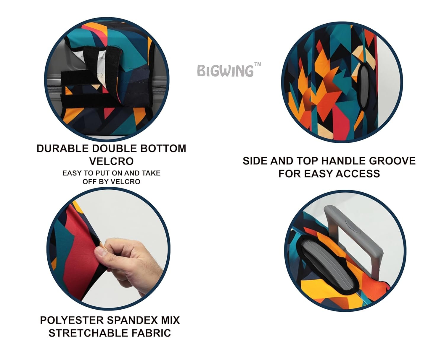 With So Much Enthusiasm And Pride Here ASPIRE ENTERPRISE Introduces BIGWING Brand Polyester Fabric Recyclable Eco-Friendly FIBER (PLASTIC) Trolley Bag Cover That Helps You To Protect Your Luggage Trolley Bag While Travelling From Dust And Scratch And It Is Easily Recognisable In Crowd Due To Our Customized Unique Beautiful Eye Catching Designs. Made Up With Premium Four Way Polyester Spandex Mix Fabric Which Is Stretchable, Durable, Easy To Use And Washable. Dress Up Your Luggage With Our Unique And Beautiful Designed Printed Trolley Bag Covers And Make A Fashion Statement. We Have Tried Hard To Provide Our Valued Customer Best Quality In Category In Best Price. Proud To Deliver Our Valued Customer A MADE IN INDIA Product.