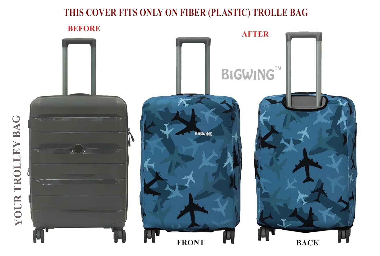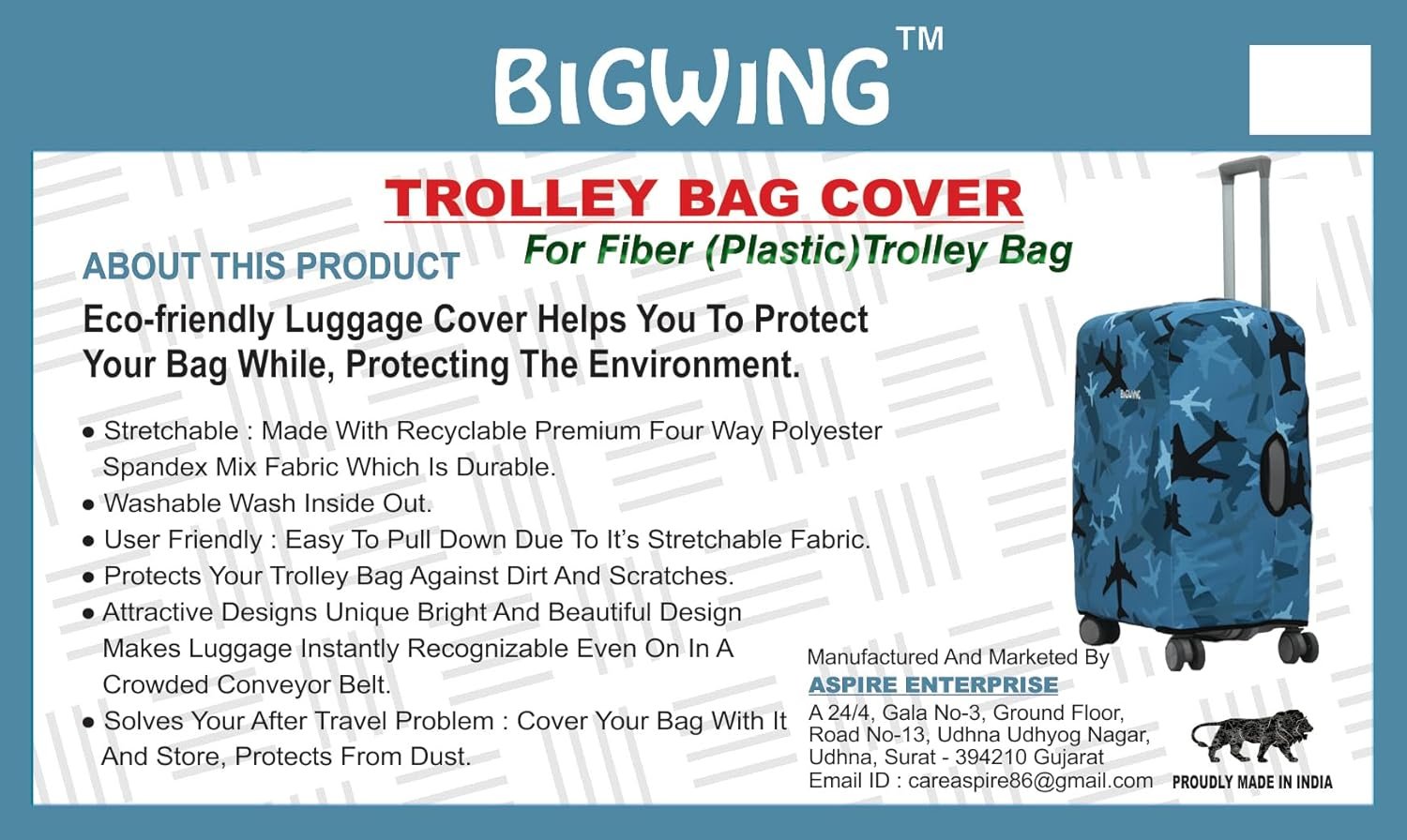 With So Much Enthusiasm And Pride Here ASPIRE ENTERPRISE Introduces BIGWING Brand Polyester Fabric Recyclable Eco-Friendly FIBER (PLASTIC) Trolley Bag Cover That Helps You To Protect Your Luggage Trolley Bag While Travelling From Dust And Scratch And It Is Easily Recognisable In Crowd Due To Our Customized Unique Beautiful Eye Catching Designs. Made Up With Premium Four Way Polyester Spandex Mix Fabric Which Is Stretchable, Durable, Easy To Use And Washable. Dress Up Your Luggage With Our Unique And Beautiful Designed Printed Trolley Bag Covers And Make A Fashion Statement. We Have Tried Hard To Provide Our Valued Customer Best Quality In Category In Best Price. Proud To Deliver Our Valued Customer A MADE IN INDIA Product.