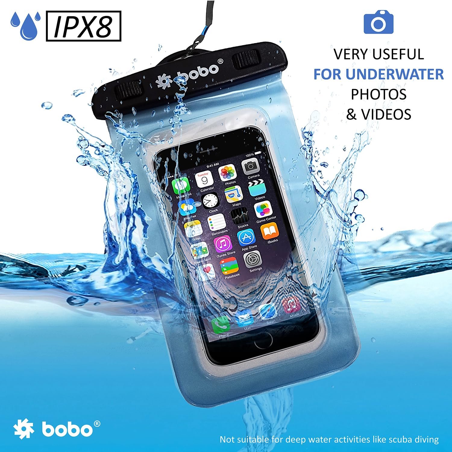 Capture underwater photos and videos. A perfect Waterproof mobile pouch cover for underwater photography. Compatible with devices up to 100 mm x 165 mm (clear window 70 mm X 135 mm); Comes with a neck strap for convenient carrying.