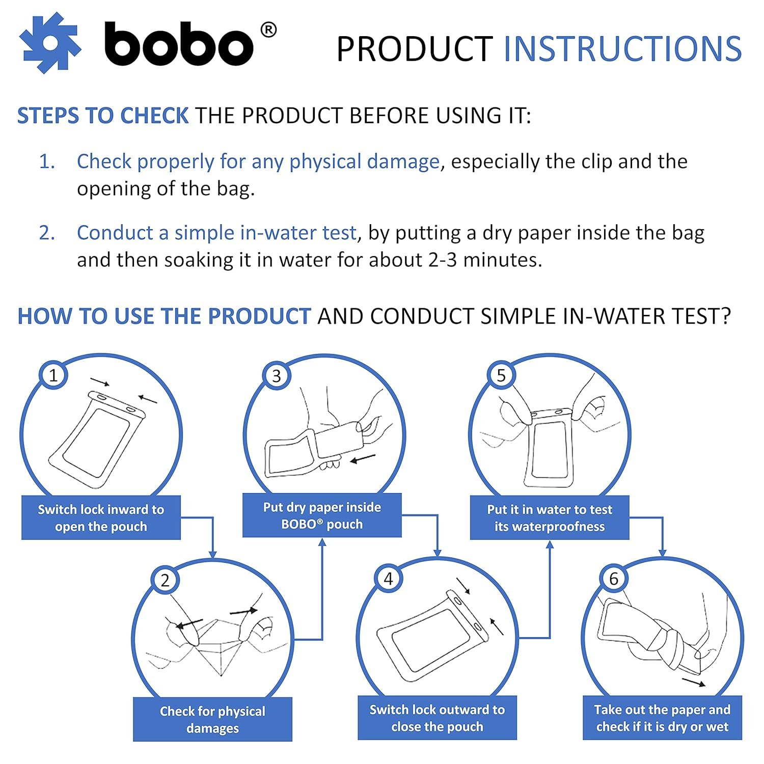 Before using the Waterproof Mobile Pouch Case Cover with your phone, just test it with a dry tissue inside, lock the pouch and put it in a bowl of water for a while. This will help you identify manufacturing defects, if any.