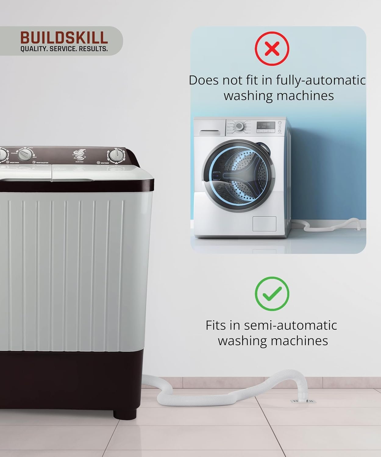 Thinking of rearranging your laundry space but worried about the water supply? Extend your setup with Buildskill’s versatile washing machine hose. Our anti-slip hook design and robust build quality allow for swift attachment to your existing pipe, increasing length without compromising strength or elasticity. It’s the quick fix that brings adaptability to your laundry routine.