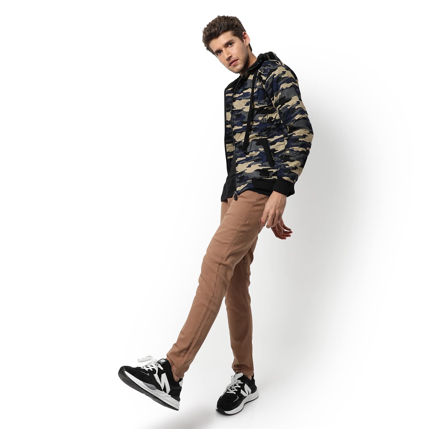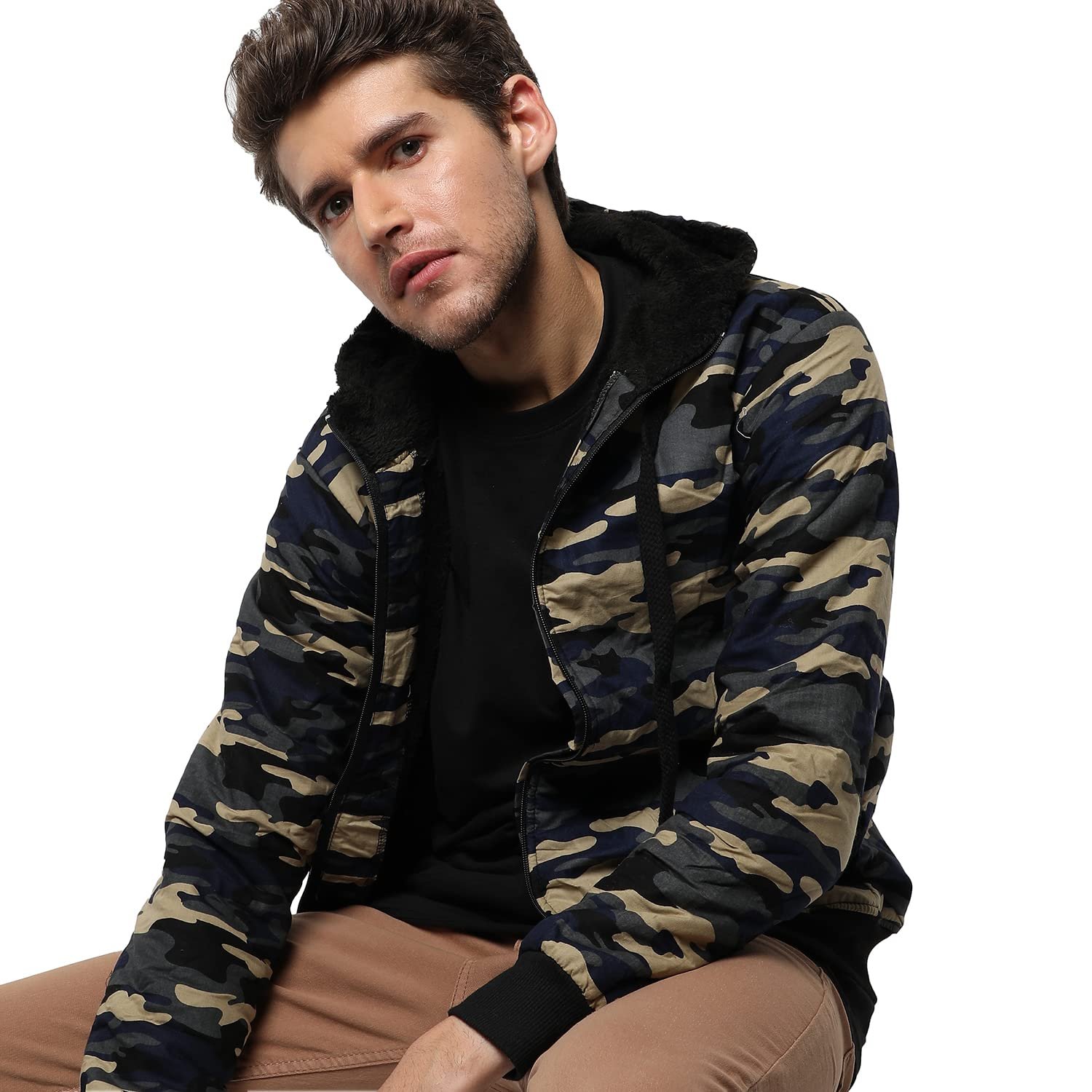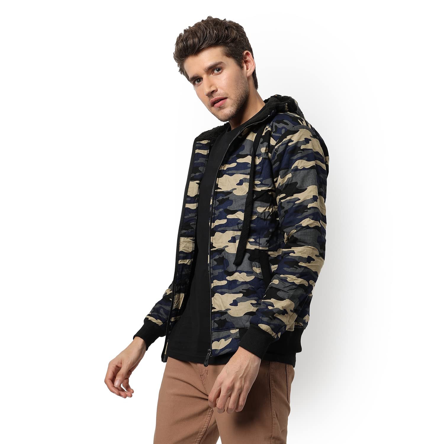 Campus Sutra Men’s Camouflage Regular Fit Cotton Jacket For Winter Wear | Hooded Collar | Full Sleeve | Zipper | Casual Jacket For Men | Western Stylish Jacket For Men