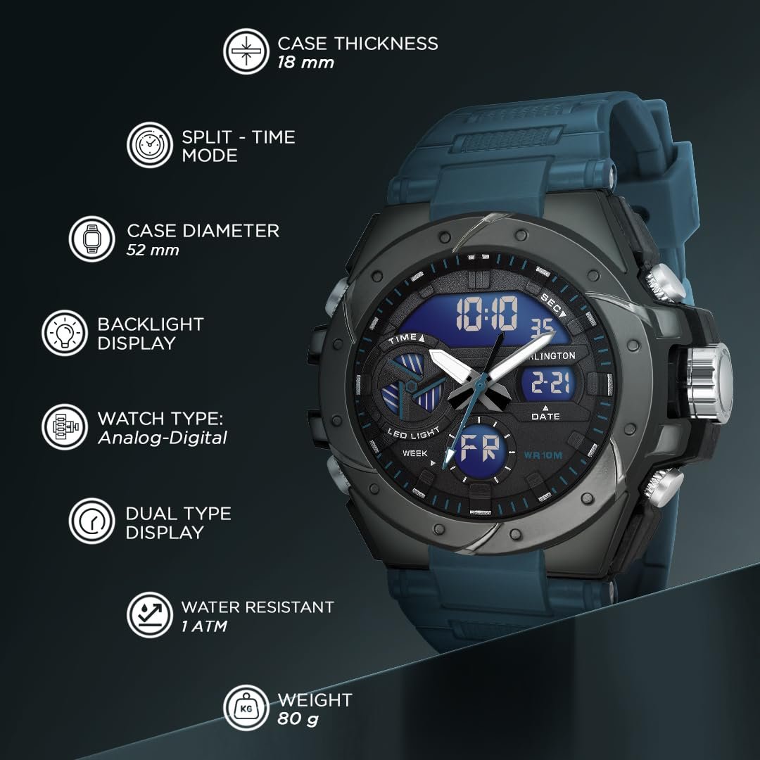Introducing the Carlington Endurance Series Analog-Digital Watch Collection, where the fusion of style and functionality is seamless. Experience low-light visibility with the backlit display, splite timer, multiple timezones effortlessly, enhance your performance with the built-in stopwatch, and rest assured with shock and water resistance. Stay on schedule with the alarm function and keep track of dates, days, months, and years. Designed for both rugged outdoor exploration and daily urban ventures, the Carlington Endurance Series redefines durability without compromising elegance. Embrace the journey, size every moment, and elevate your timekeeping with Carlington Endurance Series Analog-Digital Watches.