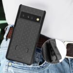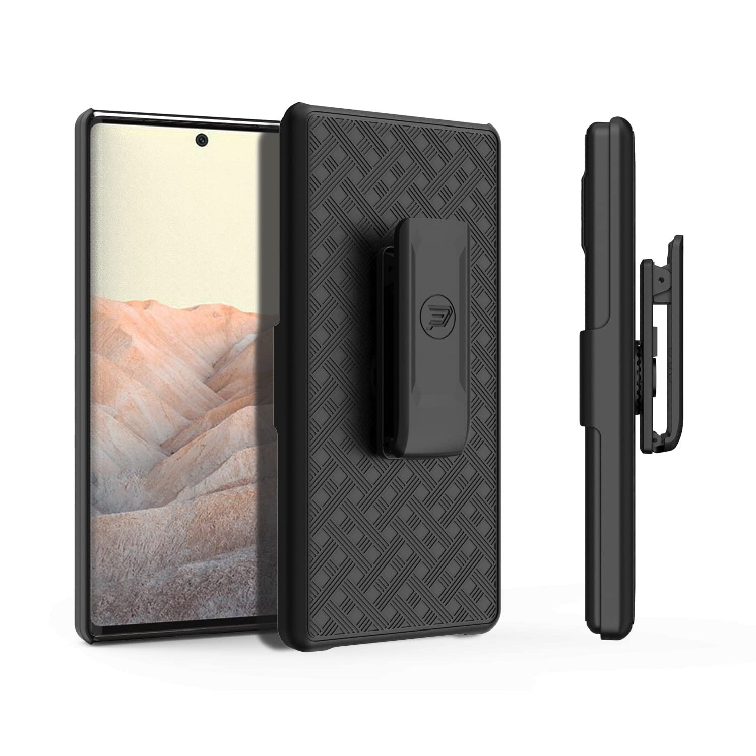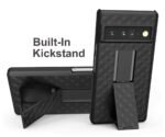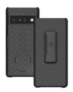 Wireless ProTech Case and Belt Clip Holster Combo designed for the Google Pixel 6 PRO phone (Screen Size 6.7 inch only) features a slim profile, open button cutouts for easy access to all functions and controls while protecting against drops, dirt, scrapes and bumps. Durable rotating belt clip adjusts 180° for either right and/or left handed use. Our case has a built-in kickstand for a hands-free viewing solution with a horizontal or vertical angle.Hard shell case and holster with a textured weave pattern with rubberized coating gives you added protection and an anti-slip grip. Secure design holster holds phone “Face-In” for optimal screen protection so your display is concealed. Your phone with our slim line case securely slides in/out of the holster for convenient daily use.