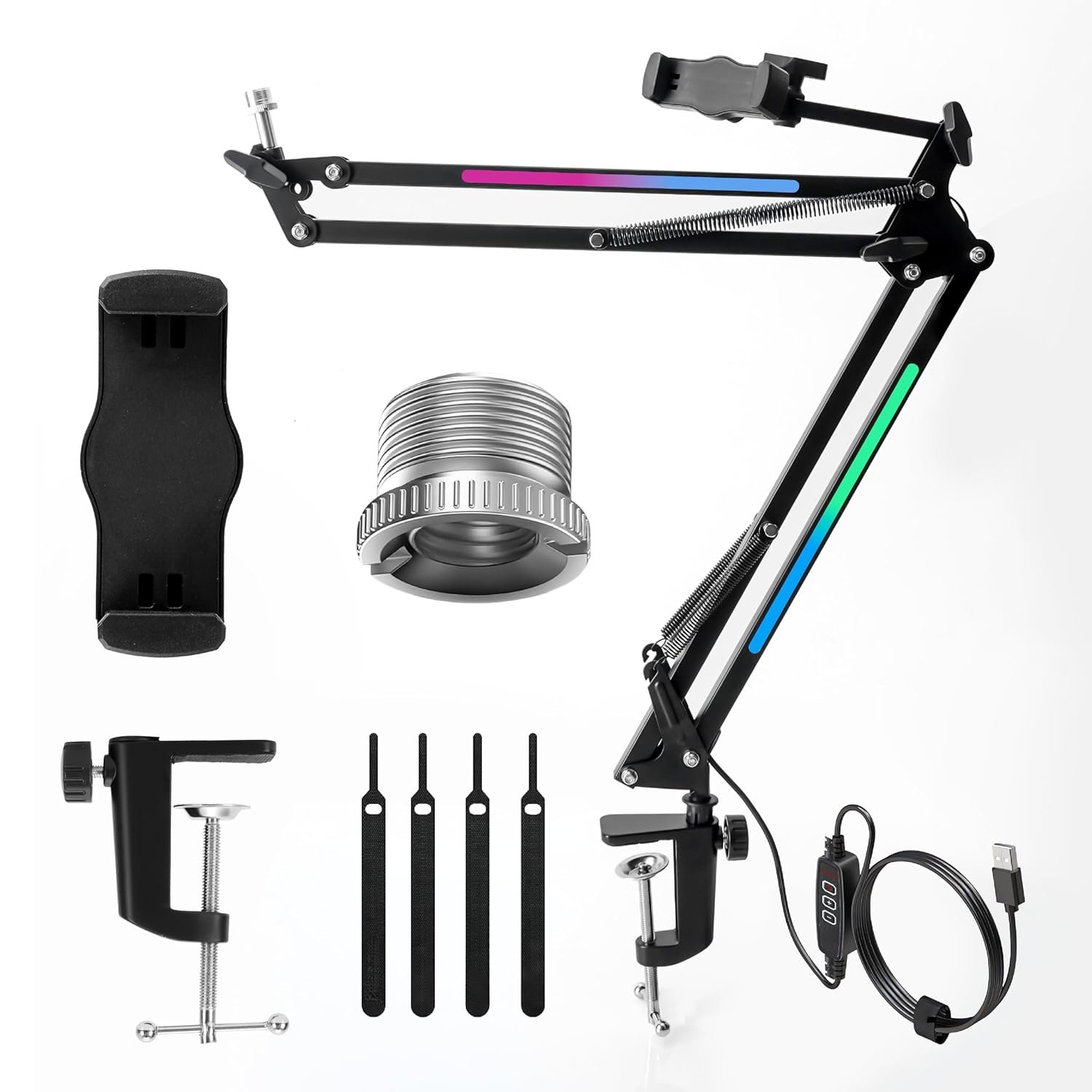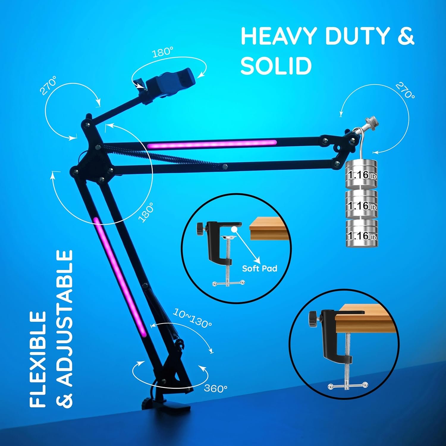 Innovative RGB Mic Arm Stand : This boom arm stand boasts a dynamic 7-color rainbow design with automatic RGB lighting. Moreover, it offers 8 selectable static colors and a Marquee LED light for added versatility. This vibrant mic stand enhances the gaming or streaming experience, creating an immersive ambiance that captivates viewers. Elevate your live streams on social media, garnering increased engagement and likes from followers.