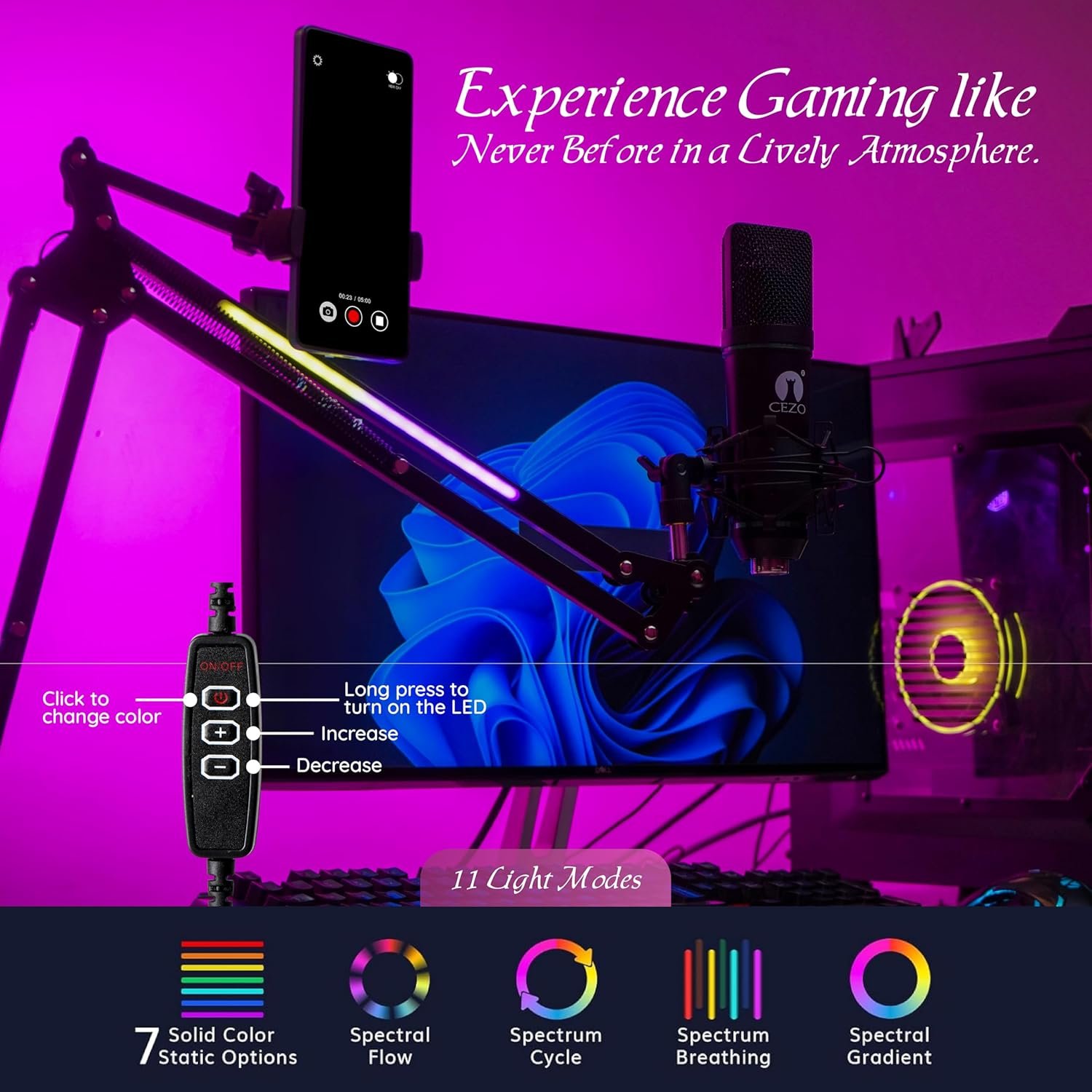 The Cezo RGB Overhead Boom Arm Microphone is built to last, with a solid and heavy-duty design that ensures stability and durability. Constructed with high-quality materials, this microphone stand can withstand regular use and handling, providing a reliable and secure platform for your microphone.”