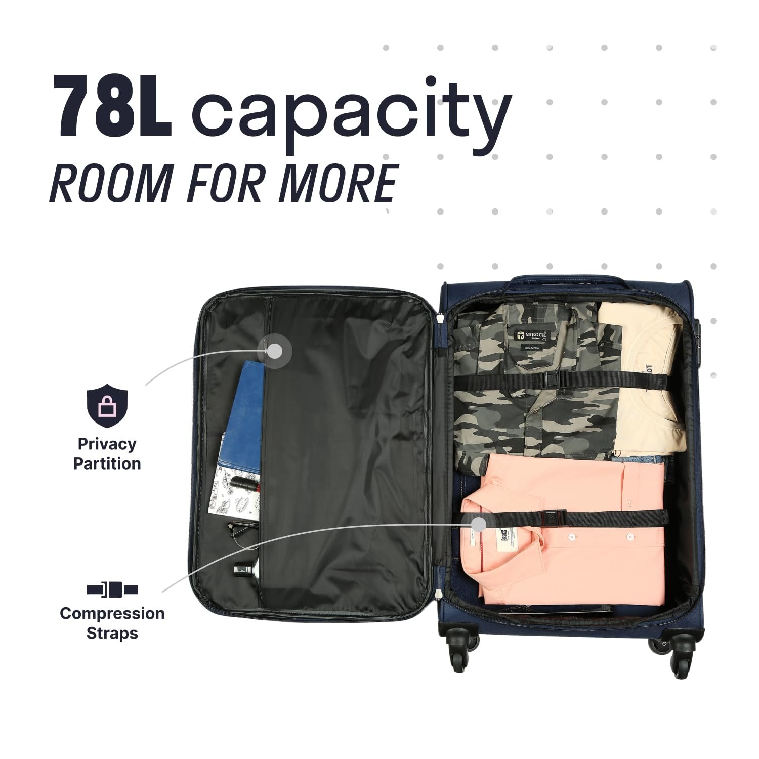 Smooth Travels: The suitcase is equipped with a 4-wheel trolley system. These silent spinner wheels make navigation through airports and stations a breeze, giving you 360 degrees of movement without effort.