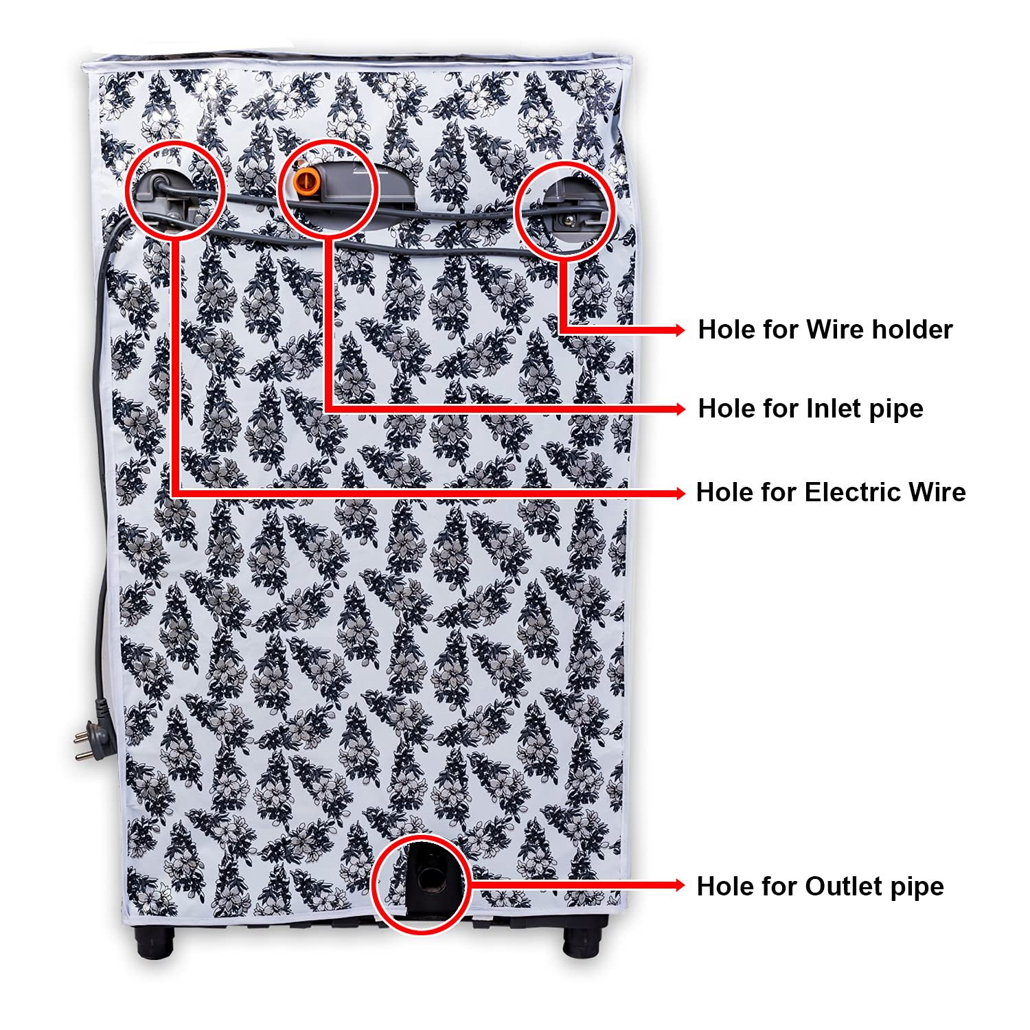 Holes provided for inlet Pipe, Outlet pipe and Power Cord. Water Proof and Dust proof Cover.