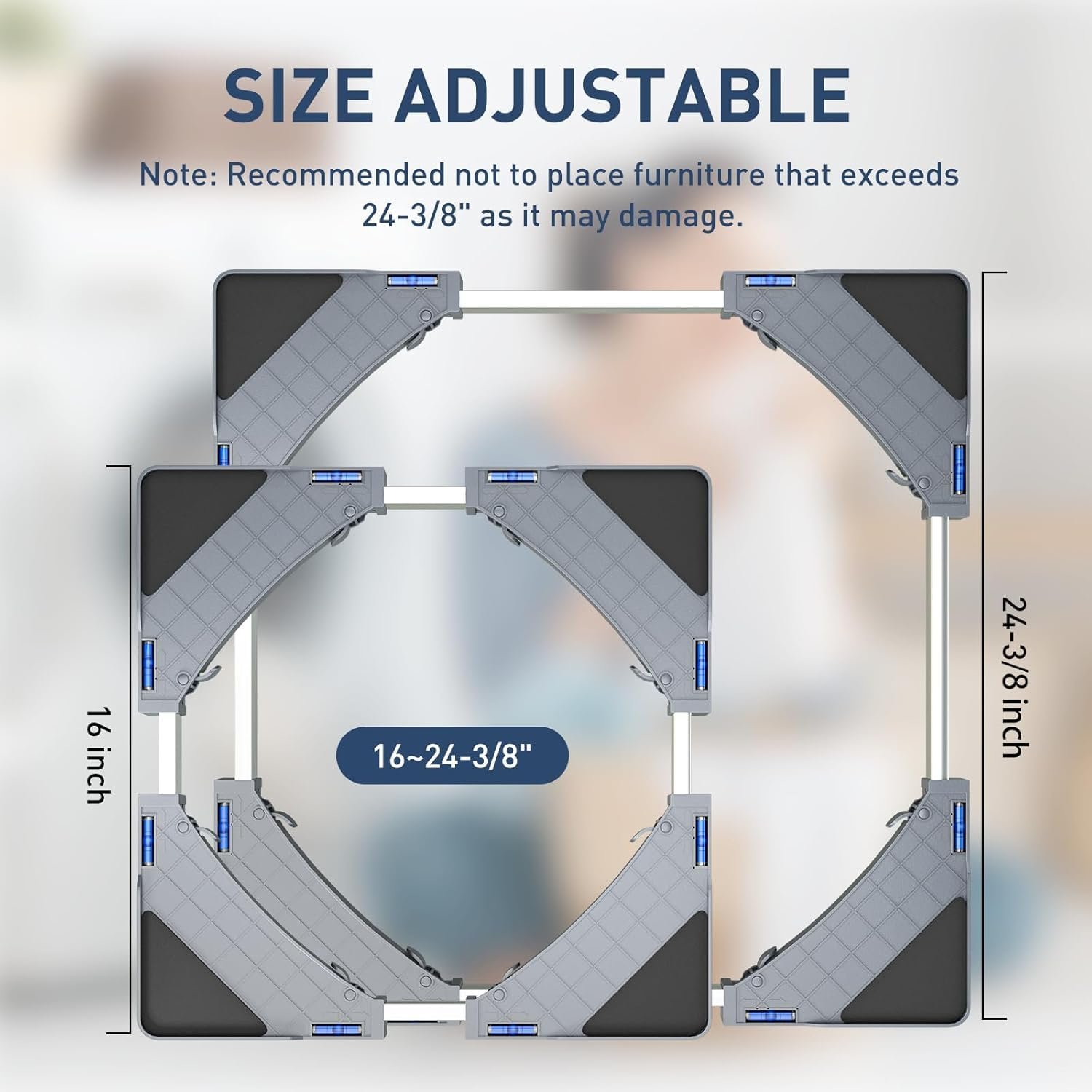 ADJUSTABLE: Adjustable dimensions (Length: 16”-25” / Width: 16”-25” / Height: 3.5”-4.5”) ensure perfect fit for different appliances, furniture, and uneven floors. Elevate appliances and furniture up to 4.5 inches off the ground to prevent water damage while reducing washing machine noise through its vibration-dampening design.