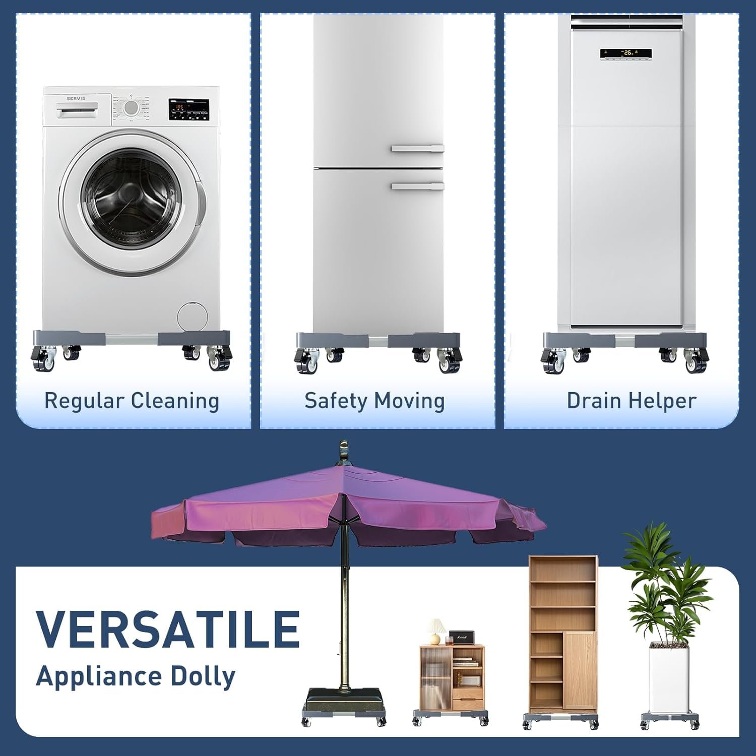 WIDE APPLICATIONS: Effortlessly lift, level, and protect your appliances! Perfect for raising mini fridges, compact washers/dryers, beverage coolers, and more in home and dorm. The appliance base creates ample under-furniture clearance, allowing effortless floor cleaning while preventing dust/mold buildup for enhanced hygiene.