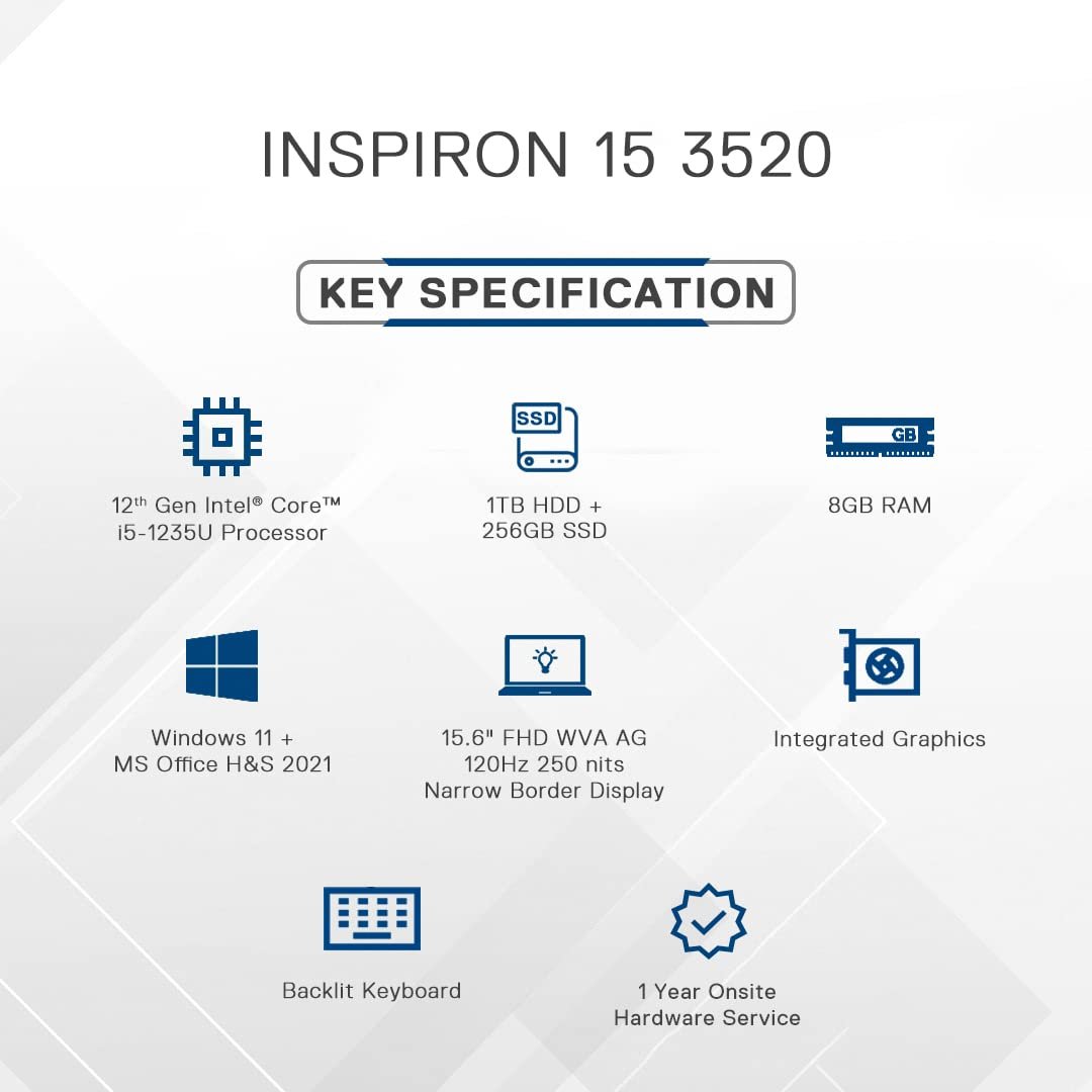 i5-1235U | 8GB DDR4 | 1TB HDD + 256GB SSD | Win 11 + Office H&S 2021 | INTEGRATED | 15.6″ FHD WVA AG 120Hz 250 nits Narrow Border | Backlit Keyboard | 1 Year Onsite Hardware Service | Dell i5 Laptop | Platinum Silver