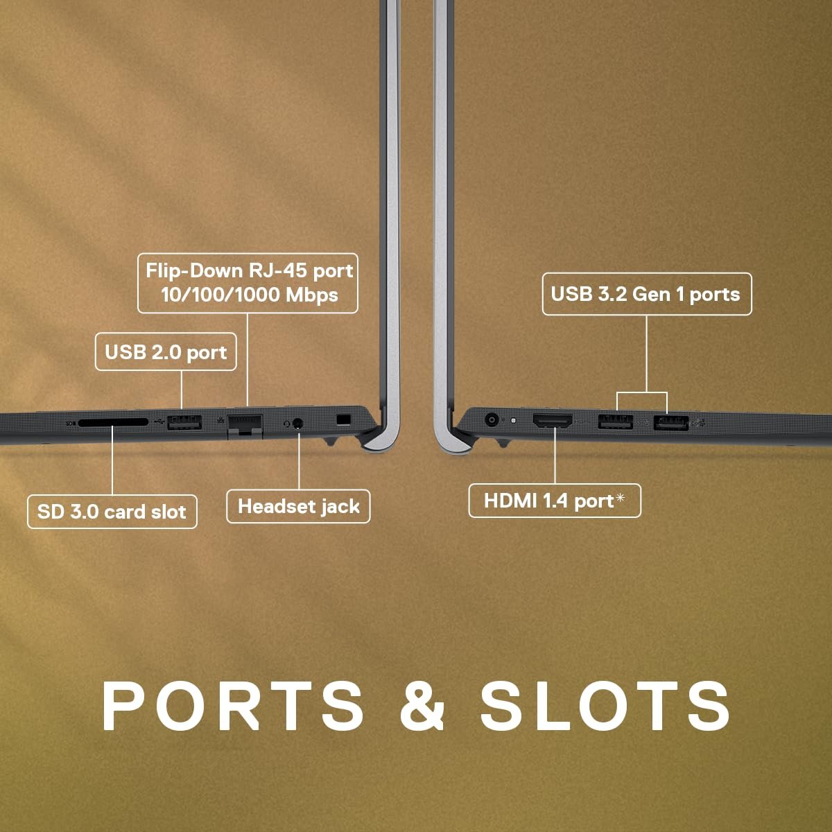 Ports: 1 USB 3.2 Gen 1 Type-C port with DisplayPort 1.4, 1 USB 3.2 Gen 1 port, 1 USB 2.0 port, 1 Headset jack, 1 HDMI 1.4 port*,1 Flip-Down RJ-45 port 10/100/1000 Mbps, 1 SD 3.0 card slot;Features- TÜV Rheinland certified Dell ComfortView to reduce Harmful blue light: 15 Months McAfee antivirus subscription: Waves Maxx Audio tuned speakers and microphones optimize audio: Hardware-based TPM 2.0 security chip