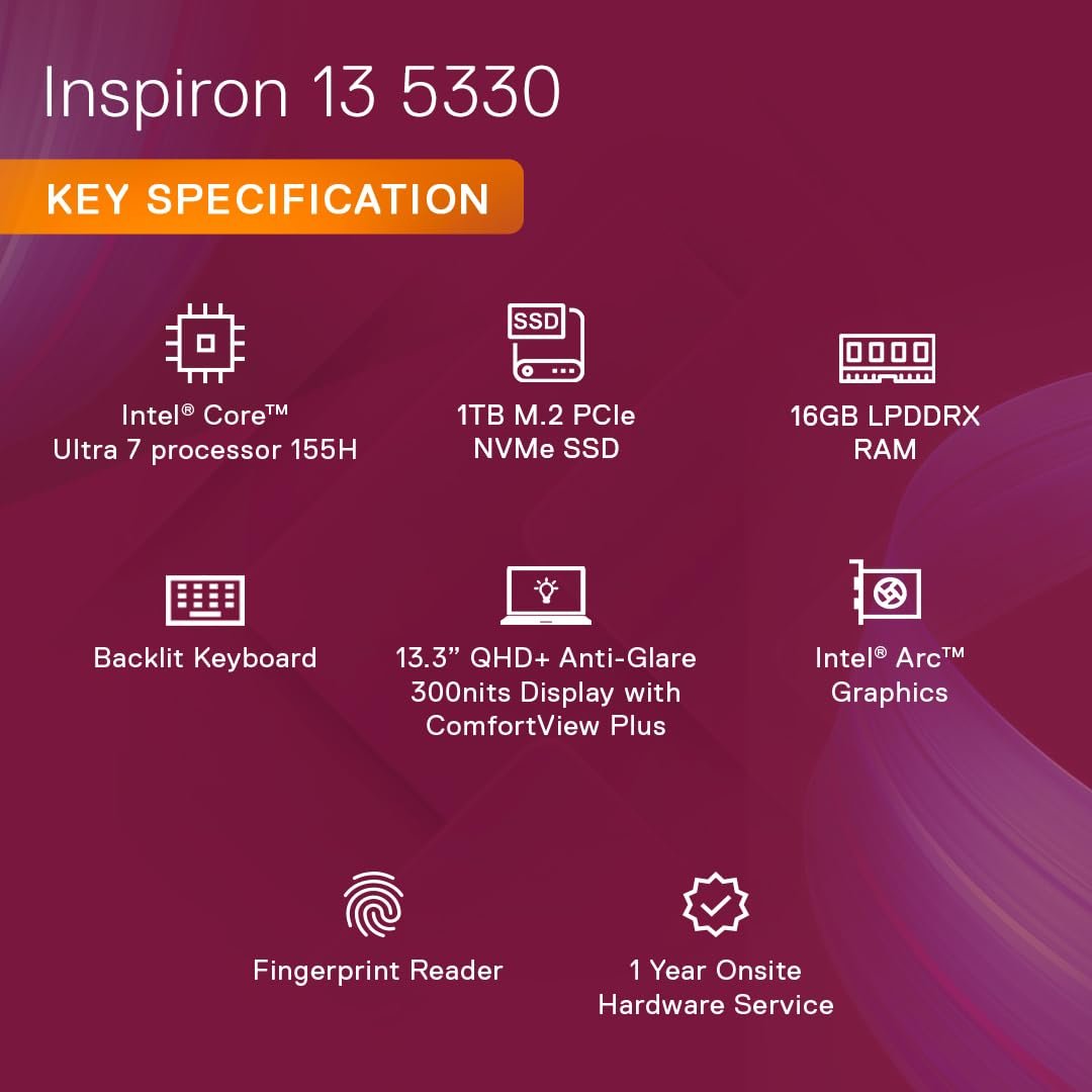 Display: 13.3″ QHD+AG NonTouch 300nits WVA Display w/ ComfortView Plus Support // Graphics: Intel Arc Graphics // Keyboard: Backlit Keyboard + Fingerprint Reader