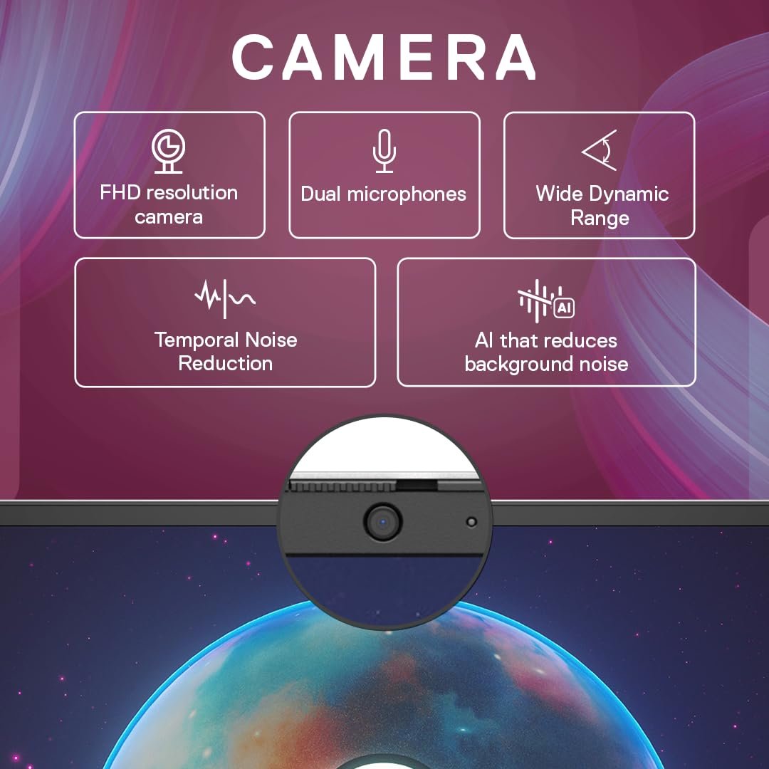 Camera & Mic: FHD camera, Built-in dual mics & AI that reduces background noise.;Batter: 4 Cell, 54 Wh, integrated // Power Adaptor: 65 Watt AC Adapter; Dimensions H x W x D( in cm): 1.65 to 1.95 X 31.4 X 22.6 // Weight: 1.59kgs