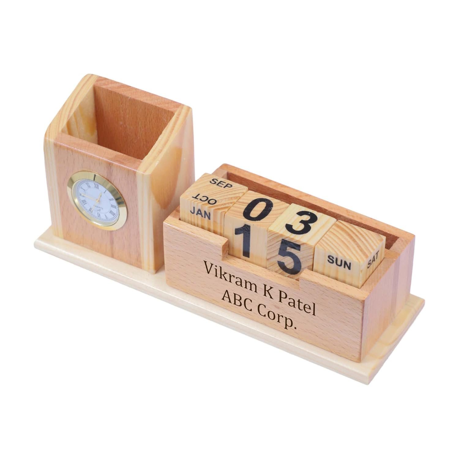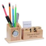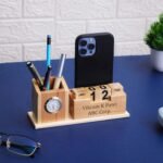 Introducing our exquisite Wooden Pen Holder, a perfect blend of functionality and aesthetic appeal crafted from premium pine wood. This meticulously designed organizer seamlessly combines practical features with a timeless natural charm to elevate your workspace. Crafted with precision and attention to detail, the pen holder boasts a warm and inviting pine wood construction, adding a touch of rustic elegance to your desk. The inclusion of a clock not only enhances its utilitarian value but also serves as a stylish timepiece, ensuring you stay organized and punctual. The Wooden Pen Holder goes beyond the ordinary by incorporating Infinity Calendar Cubes. These mesmerizing cubes allow you to effortlessly navigate through dates, bringing a touch of perpetual sophistication to your workspace. Keep track of your schedule with ease, all while enjoying the perpetual beauty of this unique calendar feature. Functionality meets modern convenience with the integrated mobile phone holder. Safely cradle your smartphone within easy reach, making it a breeze to access important calls, messages, or notifications without cluttering your desk. The thoughtfully designed visiting card holder adds another layer of practicality, providing a dedicated space to keep your business cards organized and accessible. Whether you’re a professional seeking an elegant desk accessory or someone who appreciates the beauty of finely crafted wooden items, our Wooden Pen Holder is the epitome of form meeting function. Elevate your workspace with this multifunctional organizer, combining the charm of pine wood with essential features that simplify and enhance your daily routine. Experience the perfect union of craftsmanship and practicality with our Wooden Pen Holder – a testament to style and functionality.