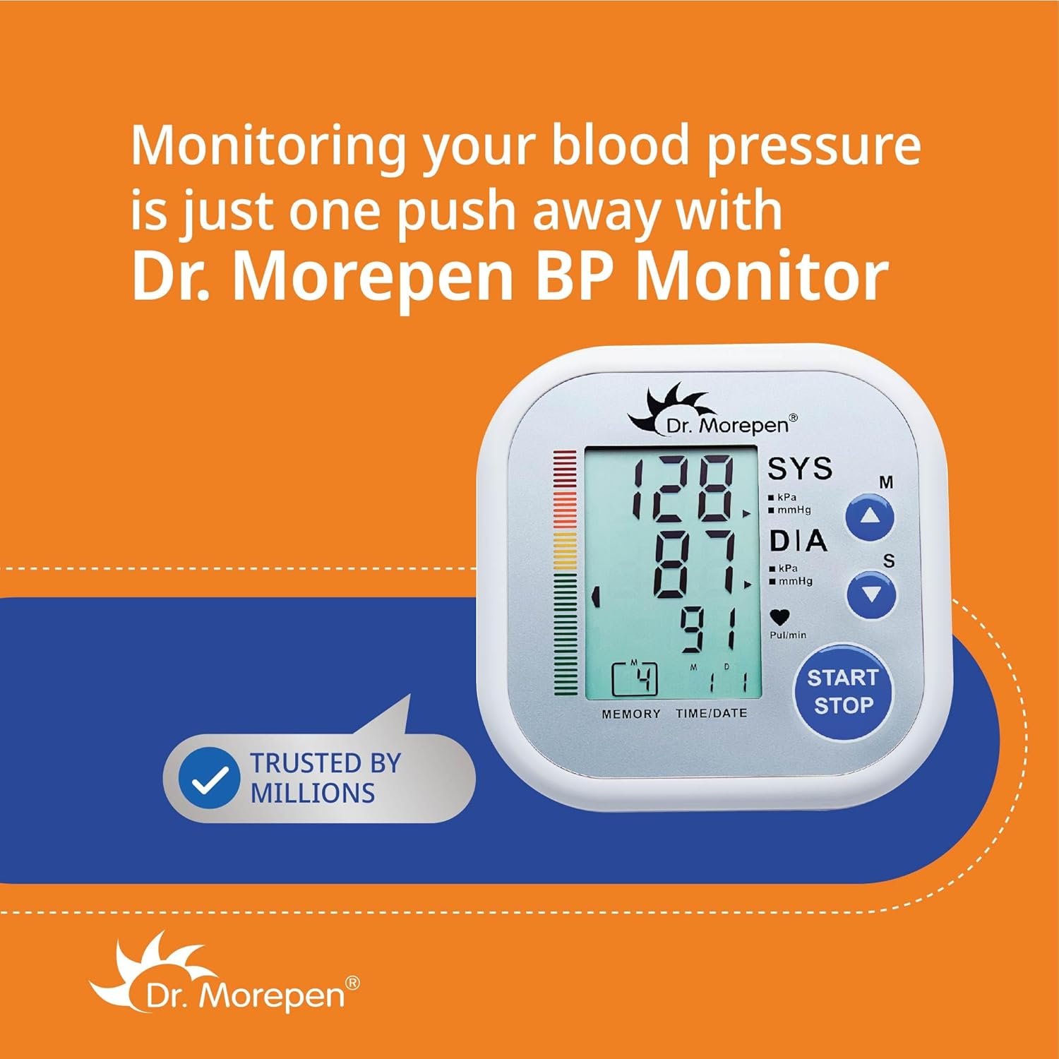 Dr. Morepen bp 02 is a fully automatic, digital blood pressure measuring device for use on the arm, which enables very fast and reliable measurement of the systolic and diastolic blood pressure as well as the pulse frequency by way of the oscilometric method of measuring. The device offers a very and clinical tested measurement accuracy and has been designed to provide a maximum of user friendliness.