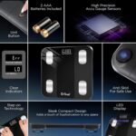 SAFE AND DURABLE DESIGN: Our 5mm tempered glass body fat weighing scale features large silicone anti-slip feet ensuring stability, safety, and easy readability. It includes low power and overload indicators, as well as automatic on/off functionality for energy efficiency. It also offers automatic calibration, low battery, and overload indications.