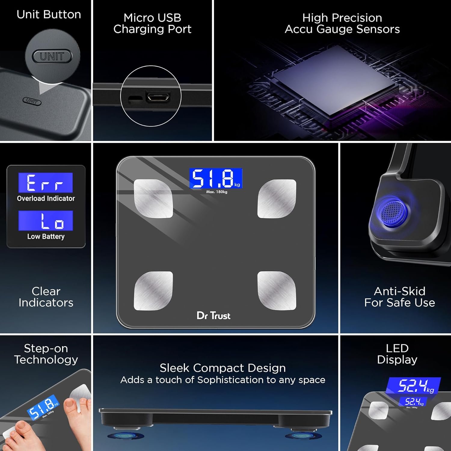 SENSOR TECHNOLOGY FOR ACCURACY: Equipped with 4 high precision sensors, the scale ensures unmatched accuracy and reliability in the form of quick results