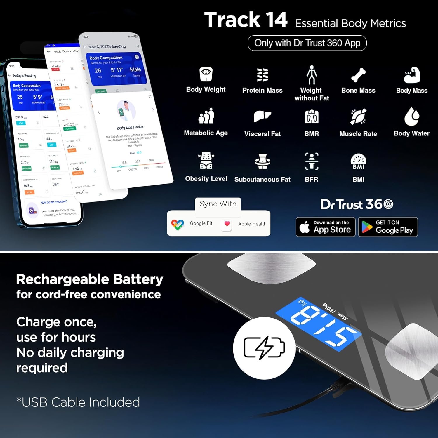 TRACK ESSENTIAL BODY METRICS : Measures body metrics including BMI, Bone mass, Muscle, BFR, BMR, Visceral fat, Body fat, Muscle weight etc.