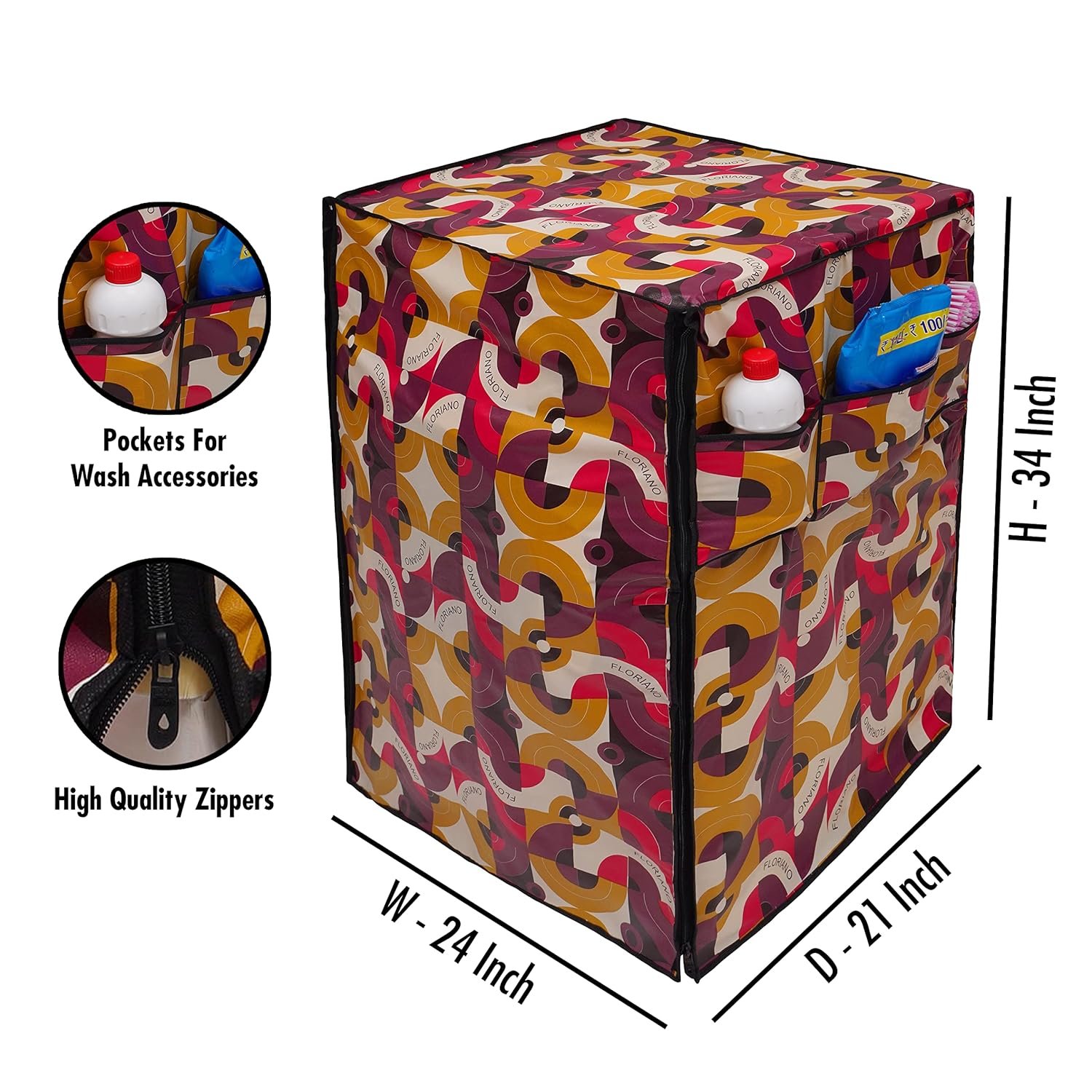 Usage: Holes provided for Inlet Pipe, Outlet Pipe and the Power Cord. Good quality zippers in the front ensure that only the flap needs to be opened while operating the machine. Side pockets help in storing all essential items like liquid detergent, brush, dusting cloth, etc.