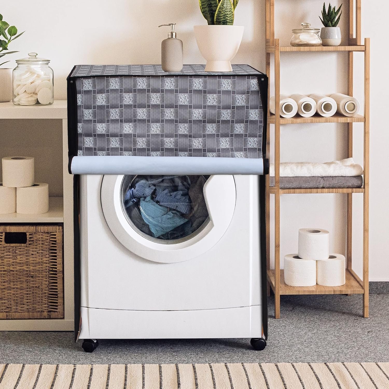 Dream Care presents this trendy washing machine cover to instantly pep up the look of your precious appliance. It comes with a quaint floral print that will appeal to your refined senses. Besides, this one will keep your washing companion free of dust and dirt while ensuring it the protection to last long. It will be the ideal buddy for your washing machines.