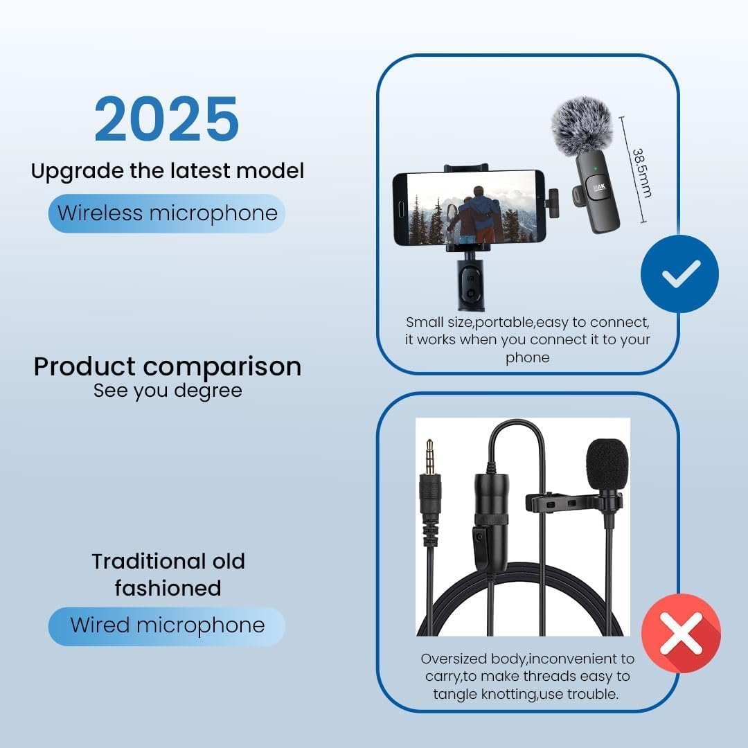 COMPACT, PORTABLE & UNIVERSAL COMPATIBILITY – Each mic weighs just 50g and includes furry windscreens, high-density sponges, and 3-in-1 adapters (Type-C, Lightning, USB). Works flawlessly with Android, iPhone, iPad, Laptop, and PC.