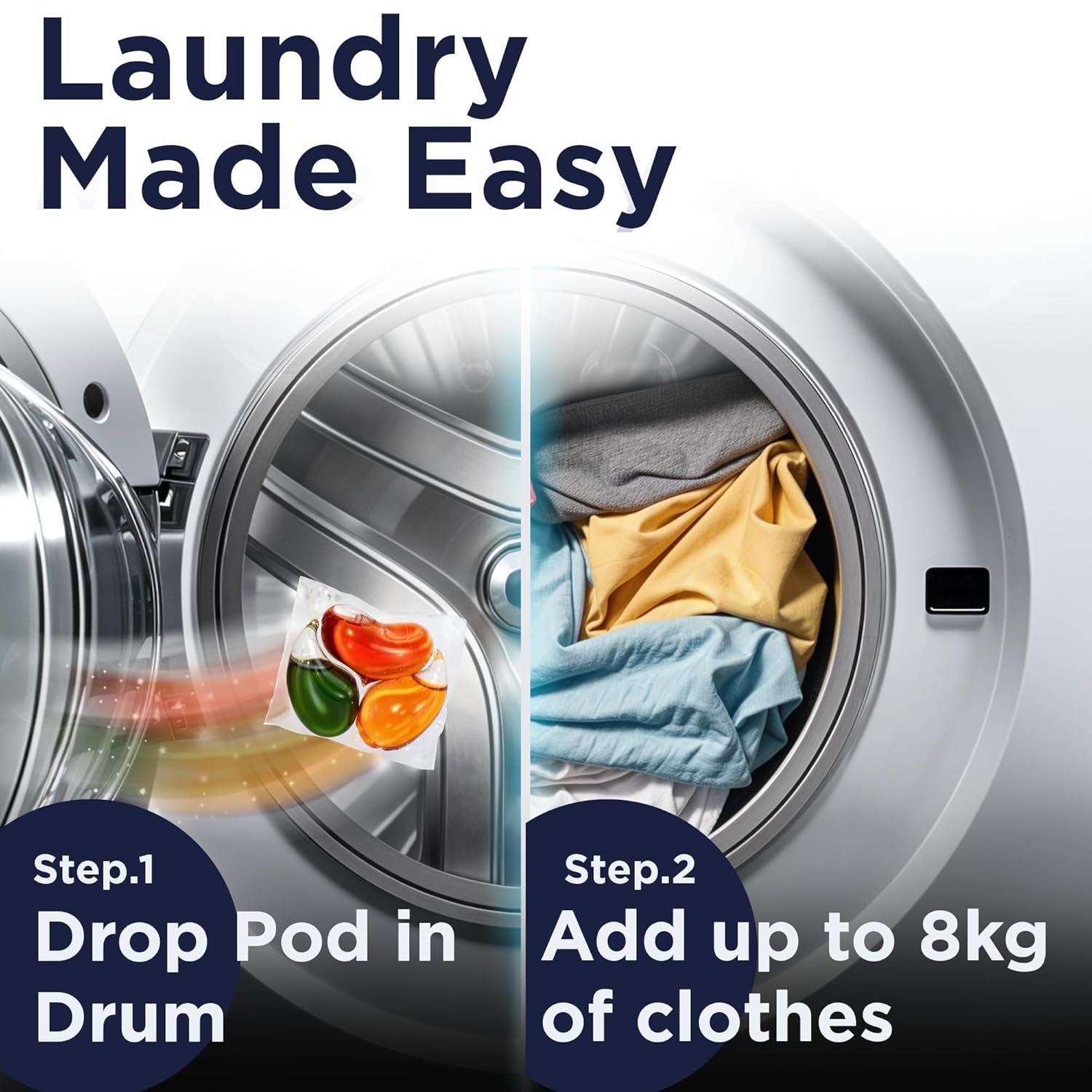 Seamless Usage Instructions: Experience laundry simplicity with straightforward usage guidelines. After placing the pod, effortlessly add your laundry (5-7kg) as usual, streamlining your routine with ease and efficiency.