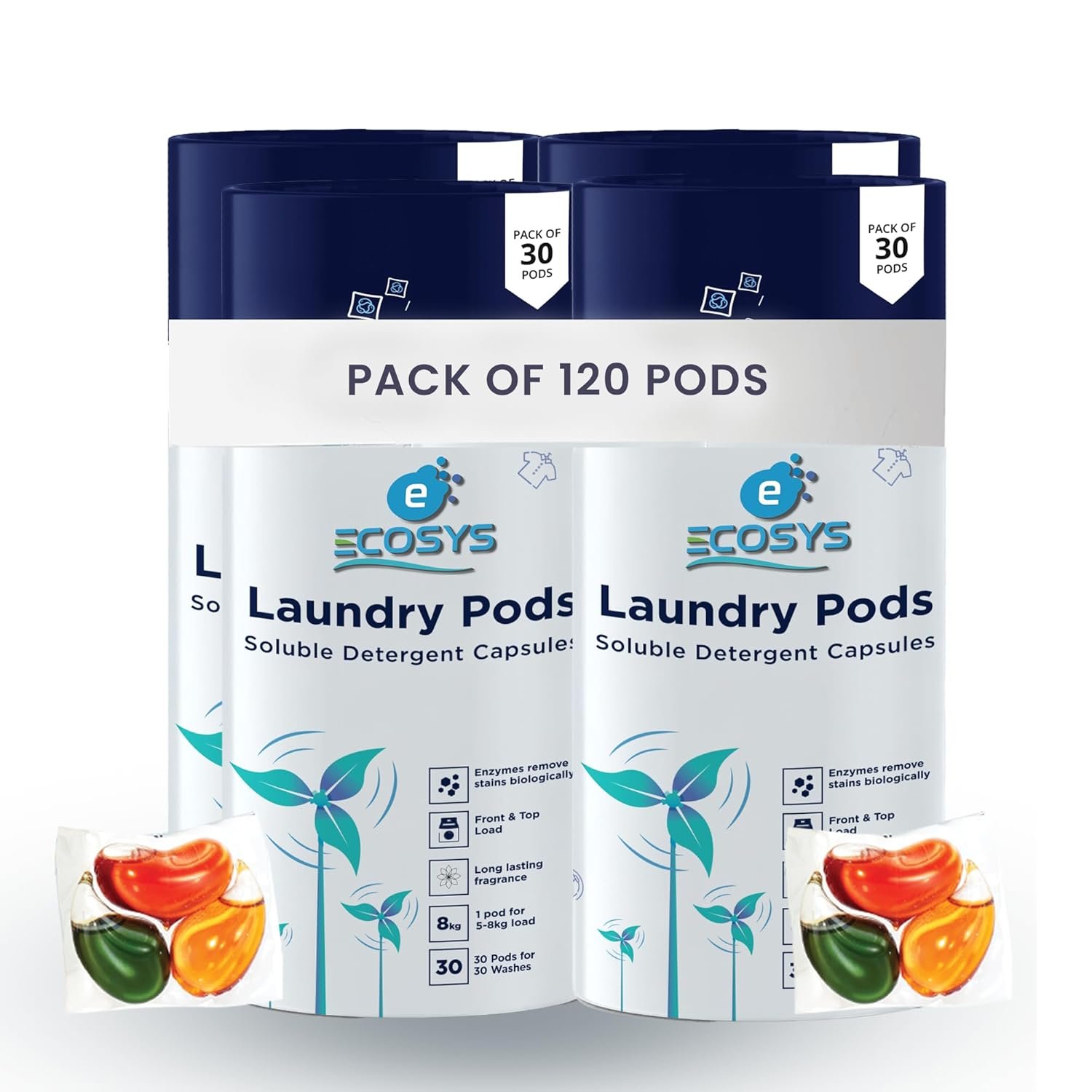 Ecosys 3-in-1 Dissolvable Magic Laundry Pods for 120 washes: Bio Enzymes Infused, Tough Stain Removal with Floral Aroma,1 Pod = 1 Wash for 5-7kg (Pack of 120)