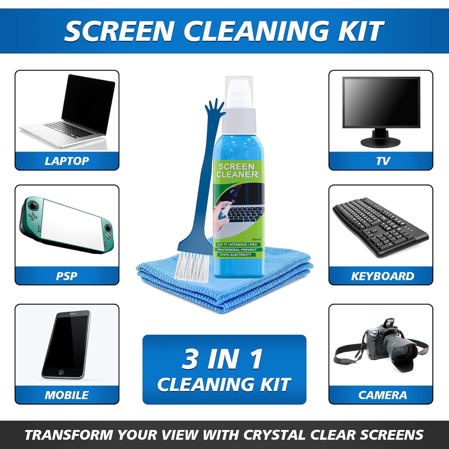 3-in-1 Screen Cleaning Kit with Soft Brush & Cloth | 100ml Spray for Laptop, PC, LCD, Electronics3-in-1 Screen Cleaning Kit with Soft Brush & Cloth | 100ml Spray for Laptop, PC, LCD, Electronics