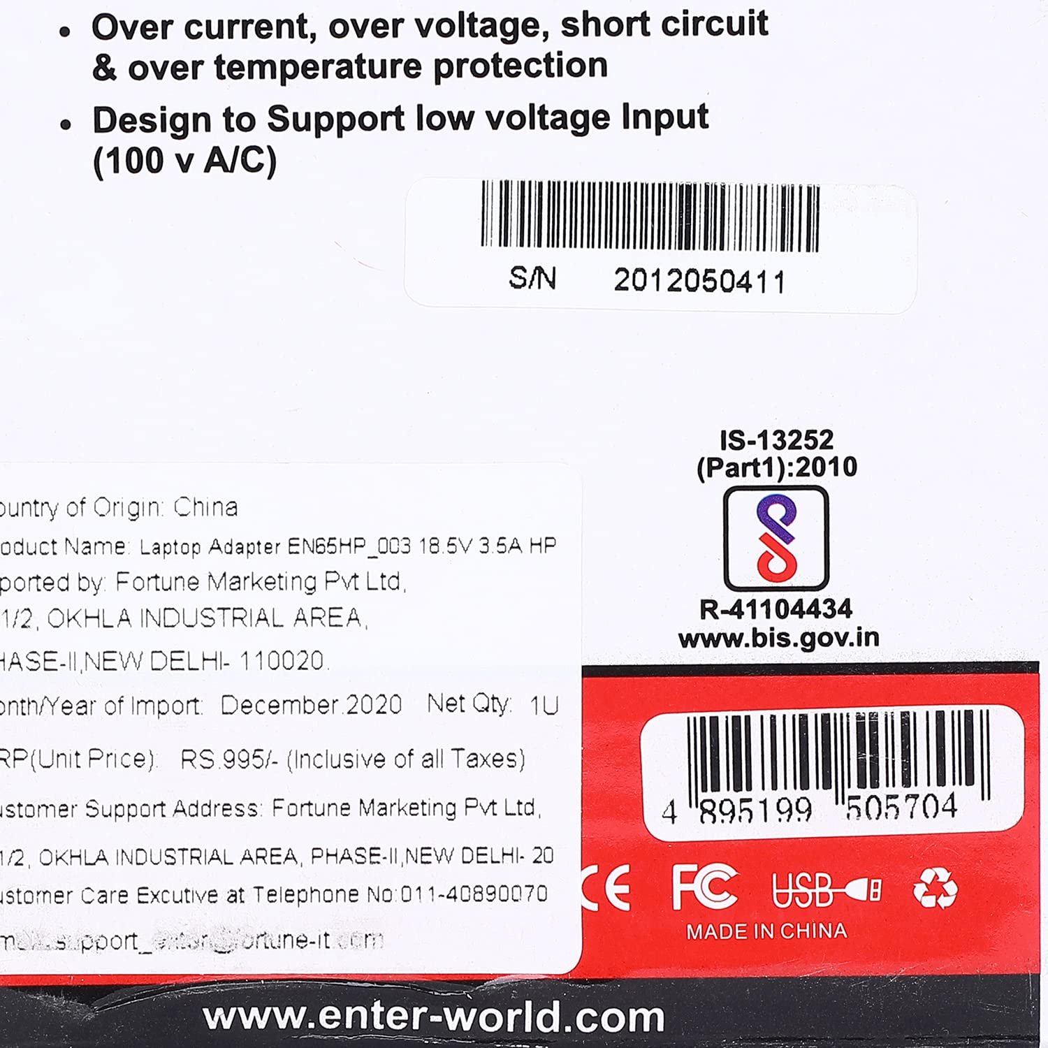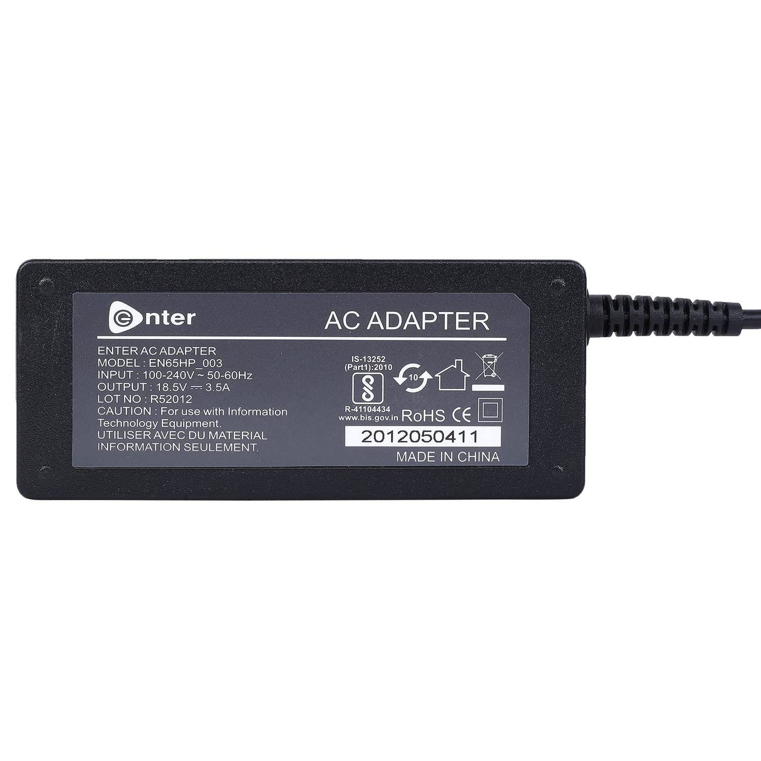 This 65W laptop adapter from Enter has an input voltage of 100-240 volts and universally accepted frequency of 50Hz-60Hz to help you charge HP laptops. Designed with 3 pin input which leads to minimize power consumption. It is portable and easy to carry. Easily connect it to your laptop and get going with your work. Comes with Low ripple operating noise and high gloss casing. Equipped with a surge protector to guard your device against power fluctuations. The adapter is lightweight for ease of use. Easily plug it into any wall outlet to deliver AC power to your laptop. 1 Year Warranty by Enter on Adapter Part. Package does not include power cord. Check Pin size before placing the order.