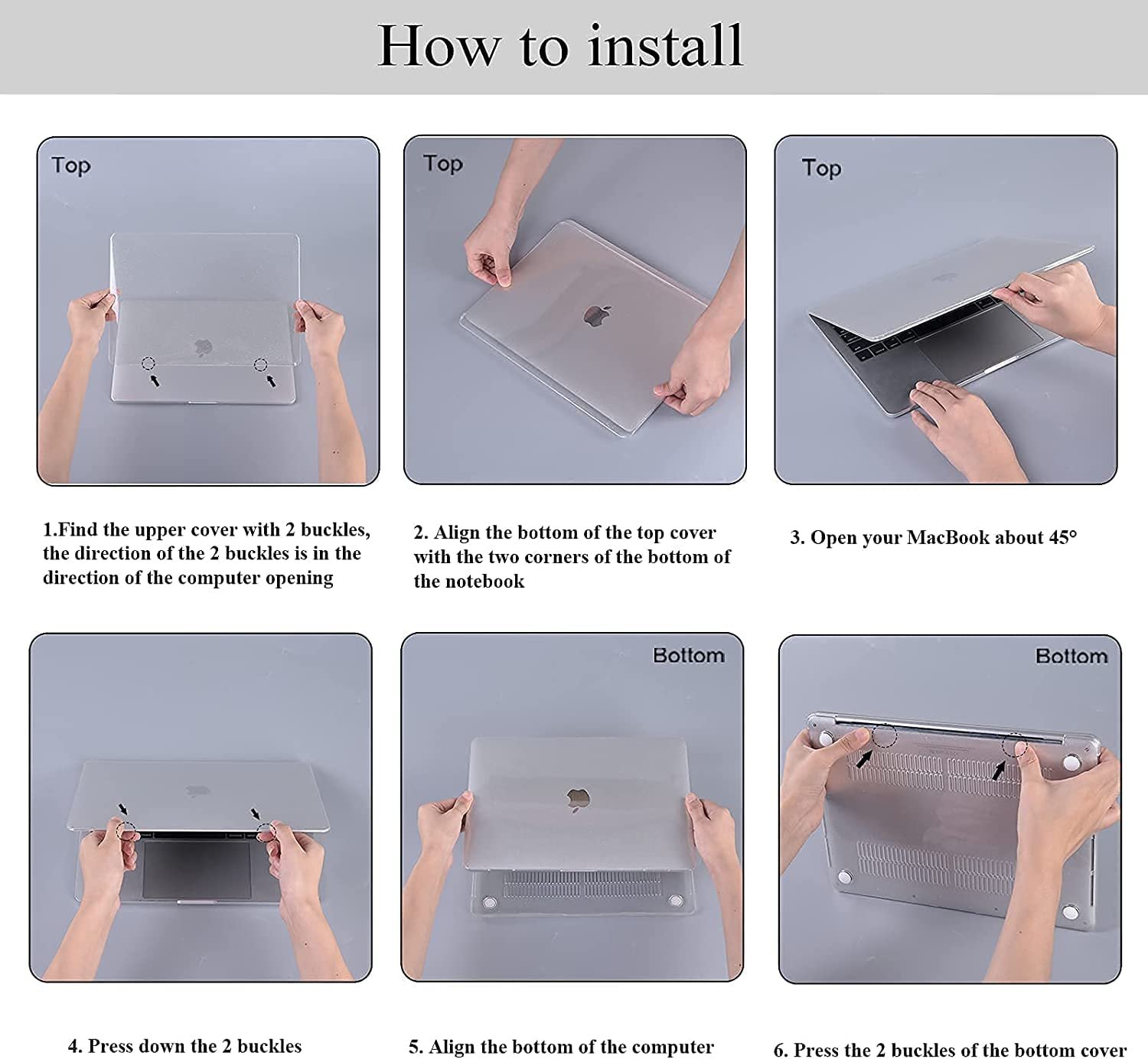 WARNING: Please follow the steps on the package to install, Not applicable to OTHER Macbook Pro13 inch case, Not applicable to EU Layout keyboard (”Enter” key is like “7”)If the item arrives with scratches, you can contact us.