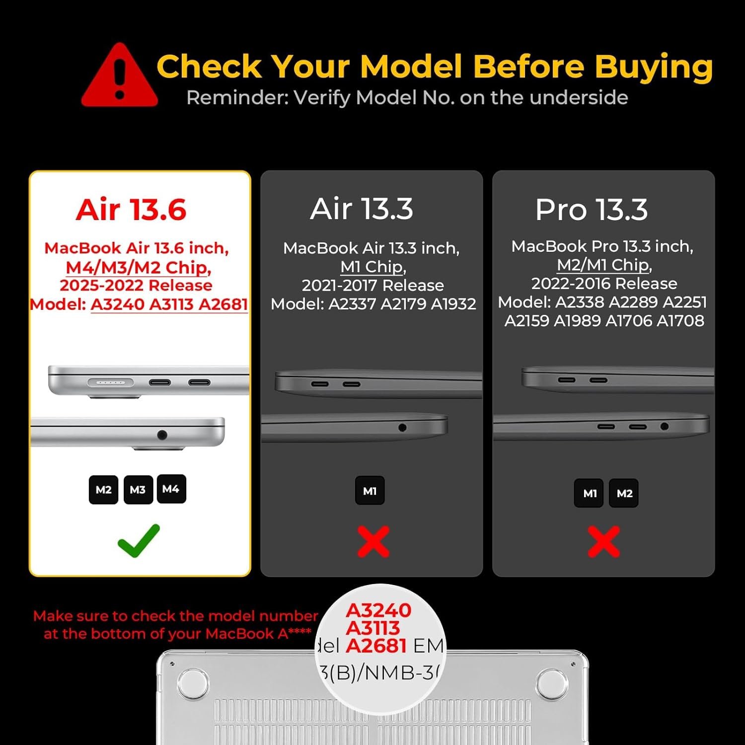 Reminder: Only Compatible with MacBook Air 13.6 inch 2025 2024 2023 2022 Release 𝐌?? M3 M2 Chip. Pls Verify the Model No.A3240 / A3113 / A2681 on the underside of your MacBook before purchase.